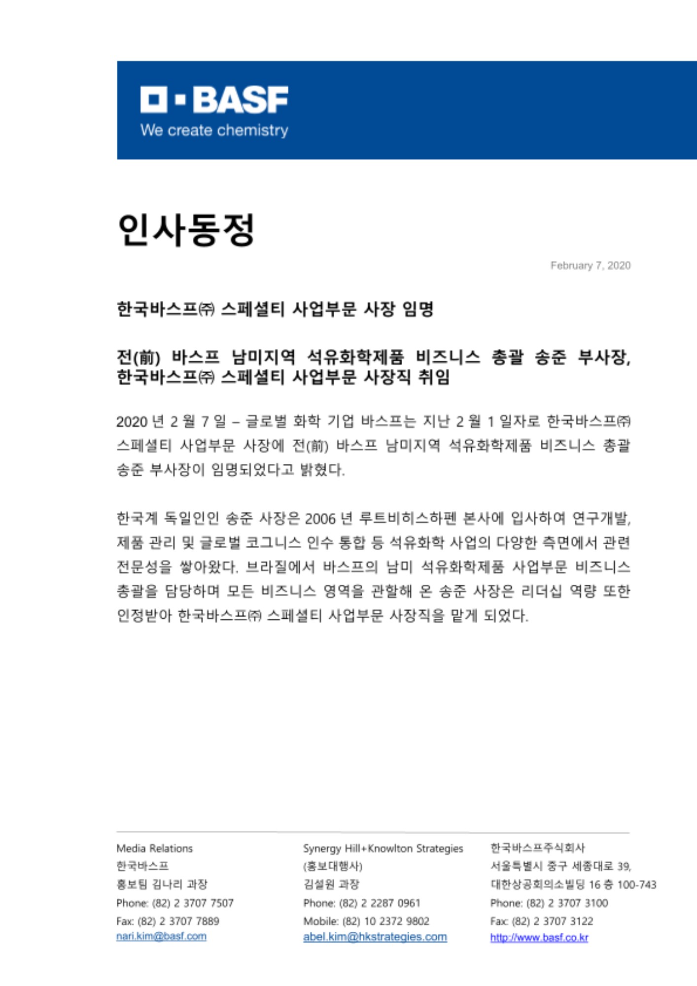 2020년 2월 7일 – 글로벌 화학 기업 바스프는 지난 2월 1일자로 한국바스프㈜ 스페셜티 사업부문 사장에 전(前) 바스프 남미지역 석유화학제품 비즈니스 총괄 송준 부사장이 임명되었다고 밝혔다.