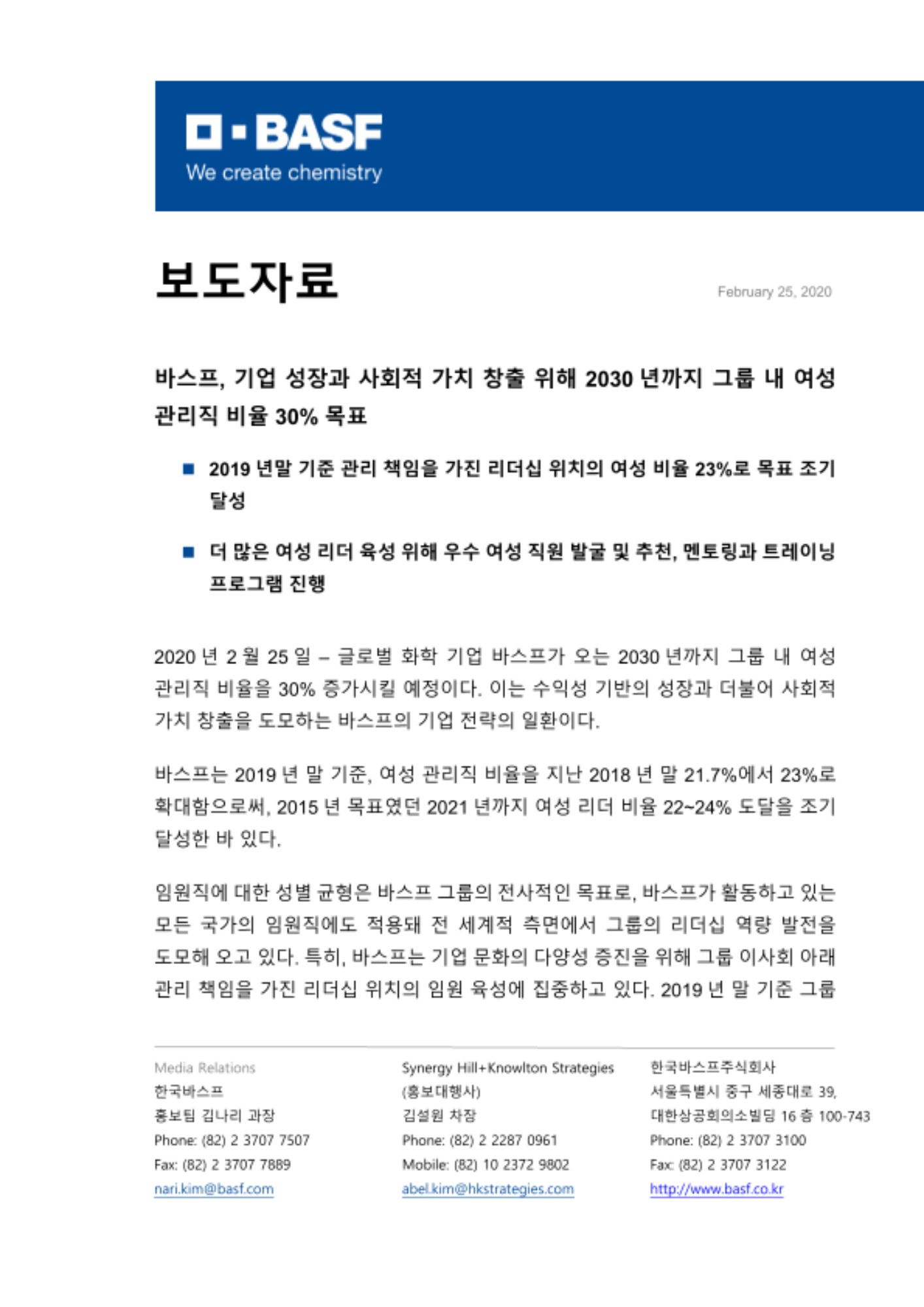 바스프 그룹 이사회 마틴 브루더뮐러(Martin Brudermüller) 의장은 “연구를 우선하는 기업으로서 바스프는 다양한 사고 방식과 능력으로부터 나오는 가치를 잘 알고 있다”며, “혁신적 아이디어와 솔루션을 제공하기 위하여, 여성의 시각과 능력을 바스프의 리더십에 더욱 활용할 계획이다” 라고 강조했다.
