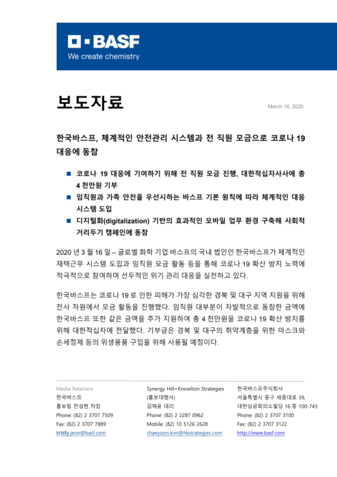 2020년 3월 16일 – 글로벌 화학 기업 바스프의 국내 법인인 한국바스프가 체계적인 재택근무 시스템 도입과 임직원 모금 활동 등을 통해 코로나19 확산 방지 노력에 적극적으로 참여하며 선두적인 위기 관리 대응을 실천하고 있다.