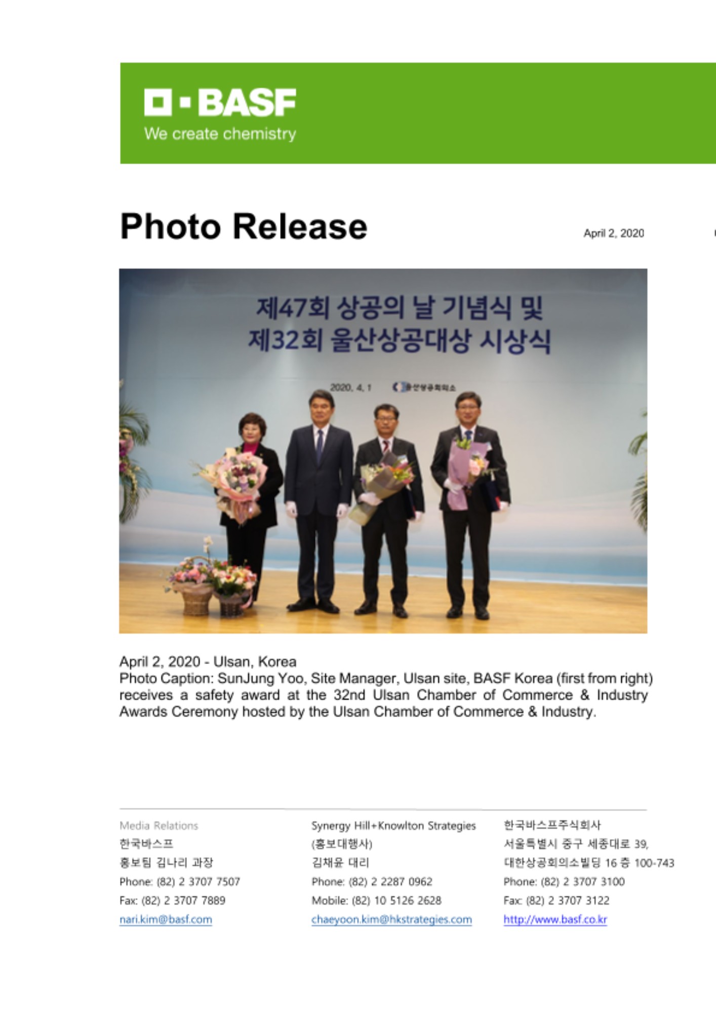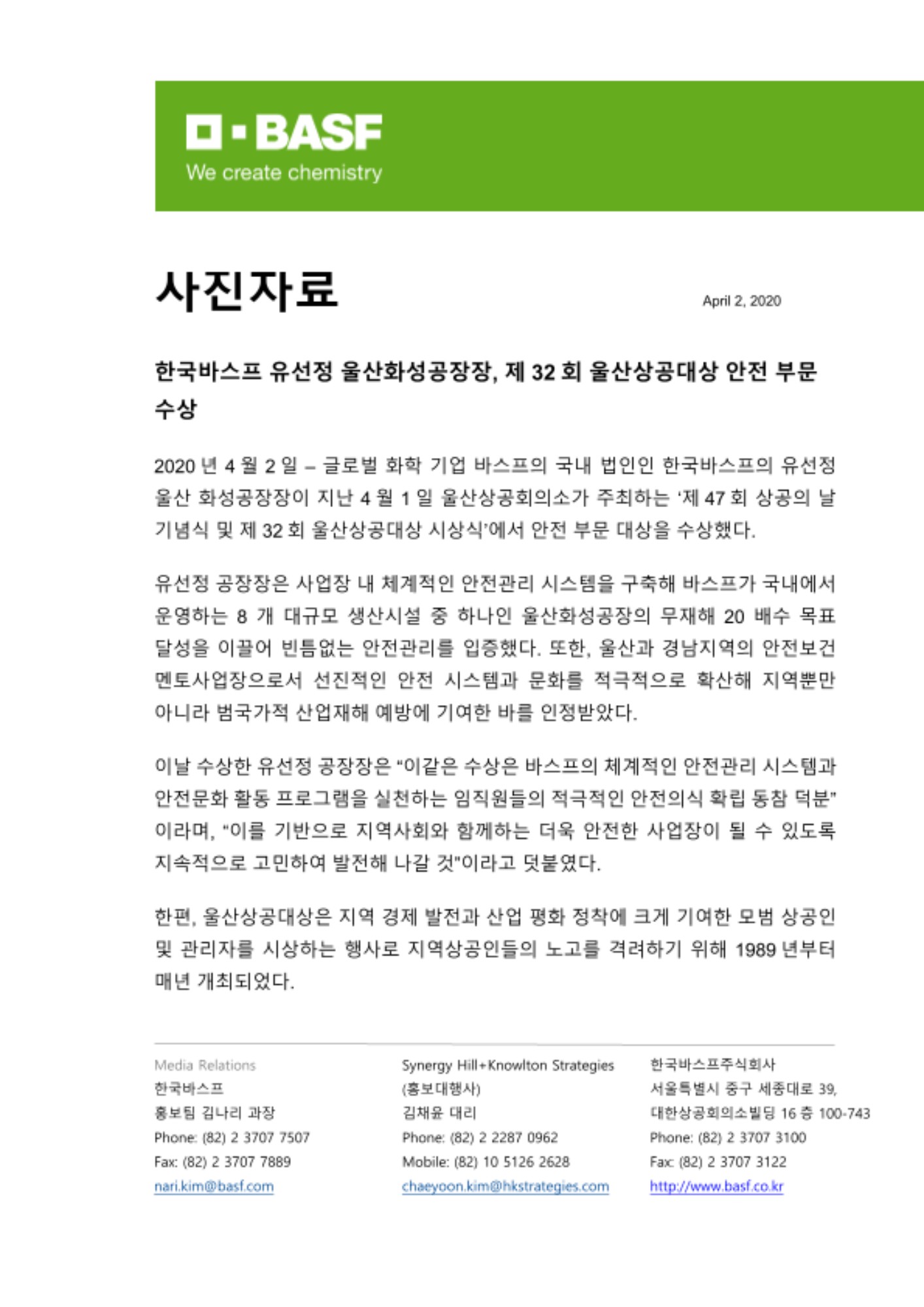 2020년 4월 2일 – 글로벌 화학 기업 바스프의 국내 법인인 한국바스프의 유선정 울산 화성공장장이 지난 4월 1일 울산상공회의소가 주최하는 ‘제47회 상공의 날 기념식 및 제32회 울산상공대상 시상식’에서 안전 부문 대상을 수상했다.