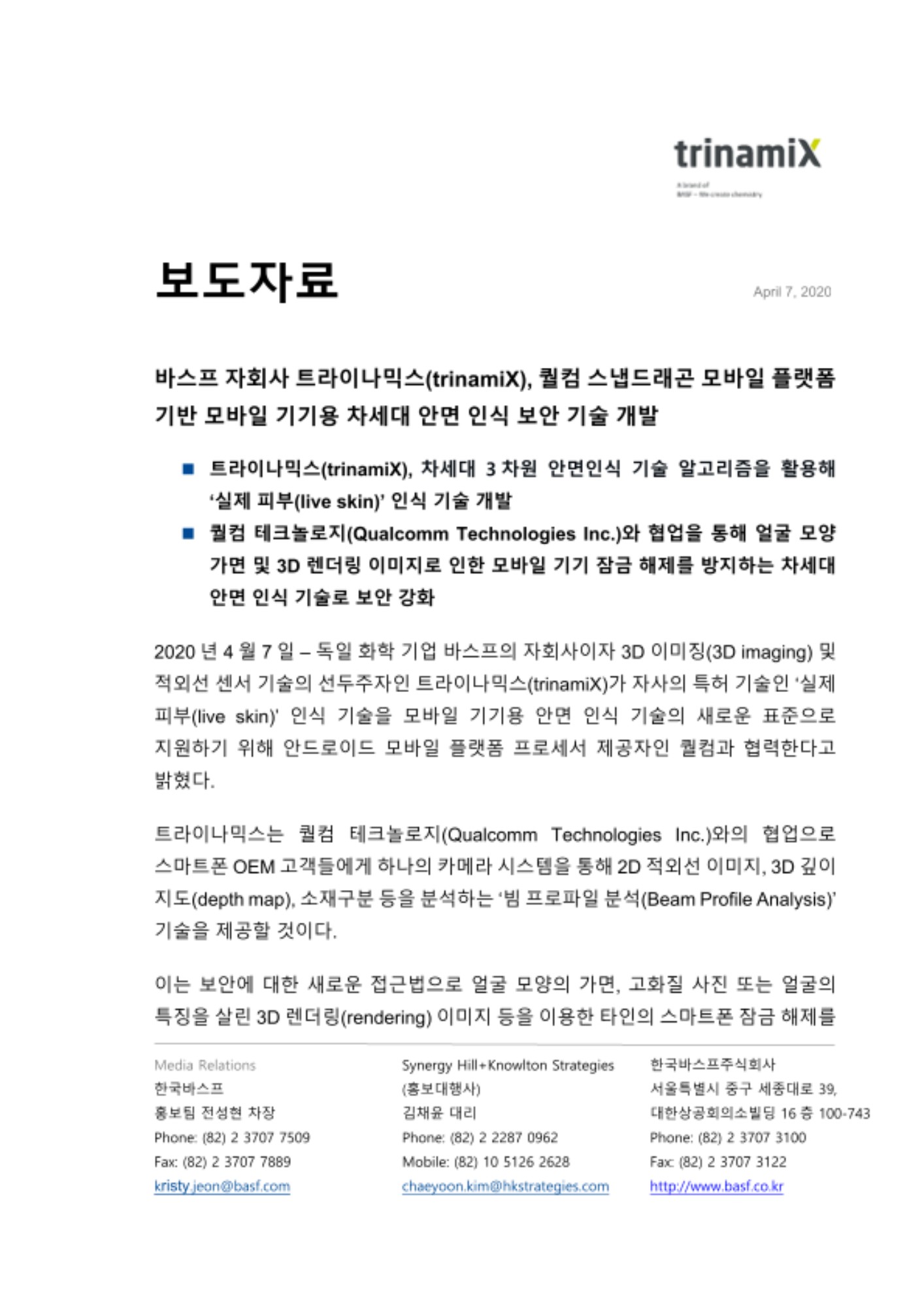 2020년 4월 7일 – 독일 화학 기업 바스프의 자회사이자 3D 이미징(3D imaging) 및 적외선 센서 기술의 선두주자인 트라이나믹스(trinamiX)가 자사의 특허 기술인 ‘실제 피부(live skin)’ 인식 기술을 모바일 기기용 안면 인식 기술의 새로운 표준으로 지원하기 위해 안드로이드 모바일 플랫폼 프로세서 제공자인 퀄컴과 협력한다고 밝혔다.