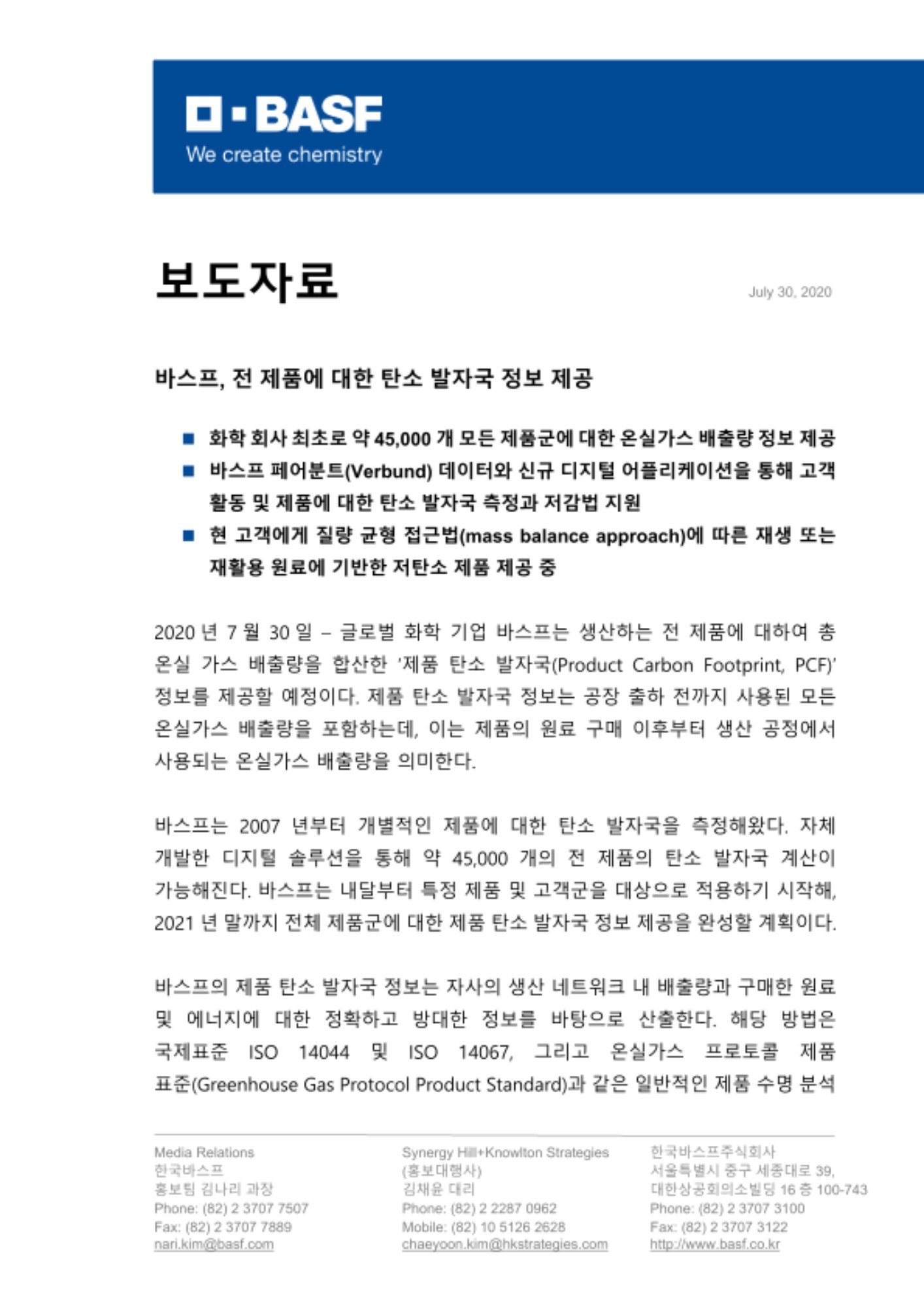 2020년 7월 30일 – 글로벌 화학 기업 바스프는 생산하는 전 제품에 대하여 총 온실 가스 배출량을 합산한 ‘제품 탄소 발자국(Product Carbon Footprint, PCF)’ 정보를 제공할 예정이다. 제품 탄소 발자국 정보는 공장 출하 전까지 사용된 모든 온실가스 배출량을 포함하는데, 이는 제품의 원료 구매 이후부터 생산 공정에서 사용되는 온실가스 배출량을 의미한다.