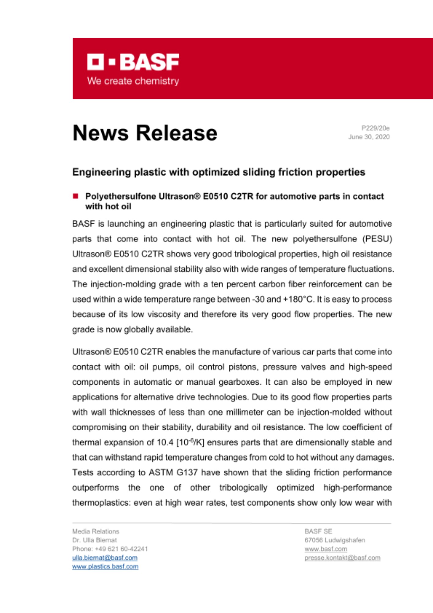 2020년9월 8일 – 글로벌 화학 기업 바스프가 고온의 기름과 접촉이 필요한 자동차 부품에 적합한 새로운 엔지니어링 플라스틱 울트라손(Ultrason®) E0510 C2TR을 출시했다.