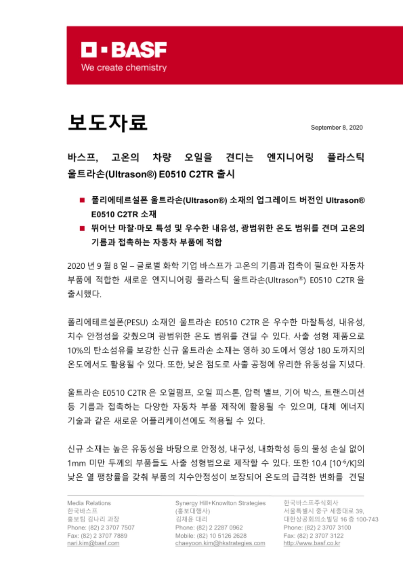 바스프, 고온의 차량 오일을 견디는 엔지니어링 플라스틱 울트라손(Ultrason®) E0510 C2TR 출시