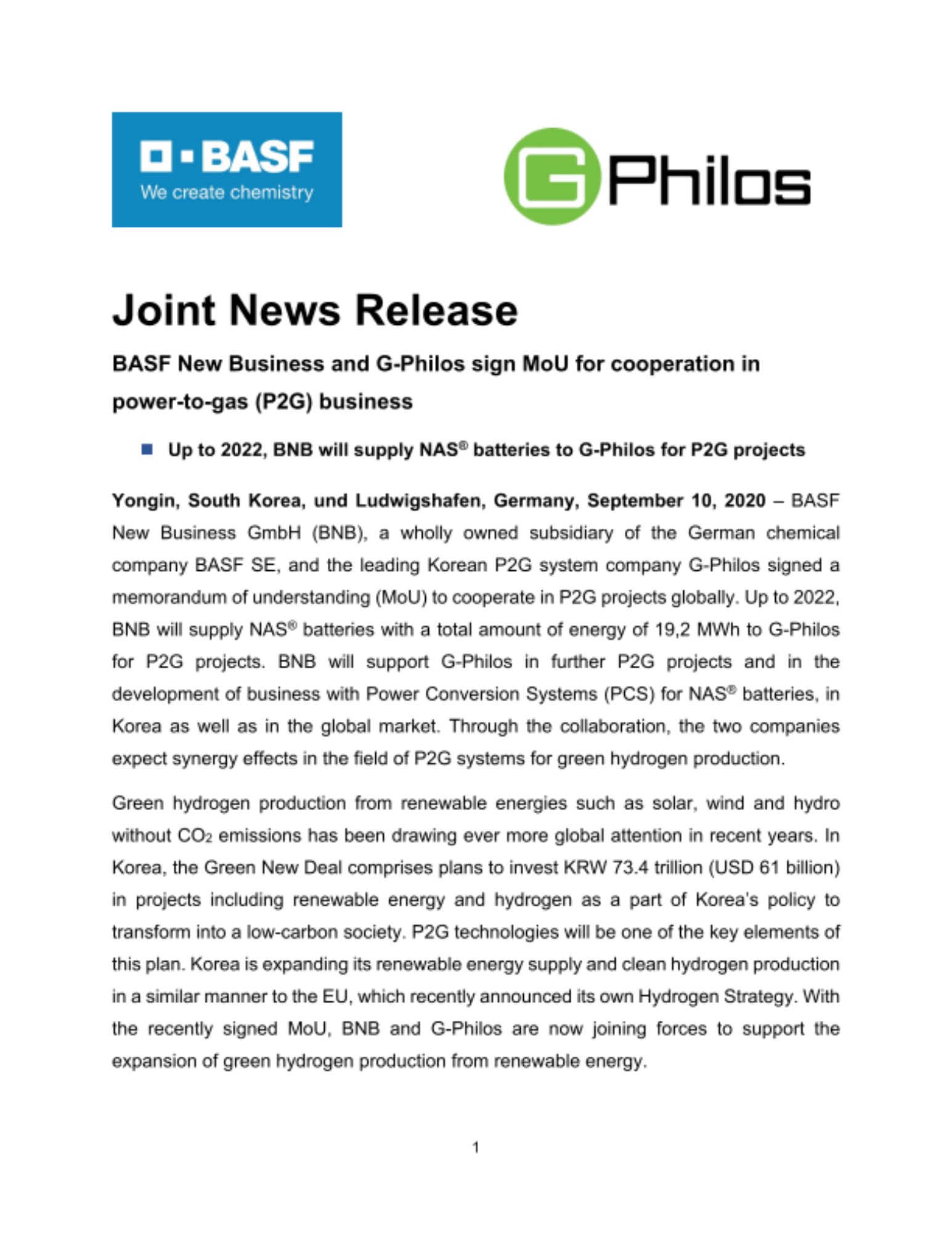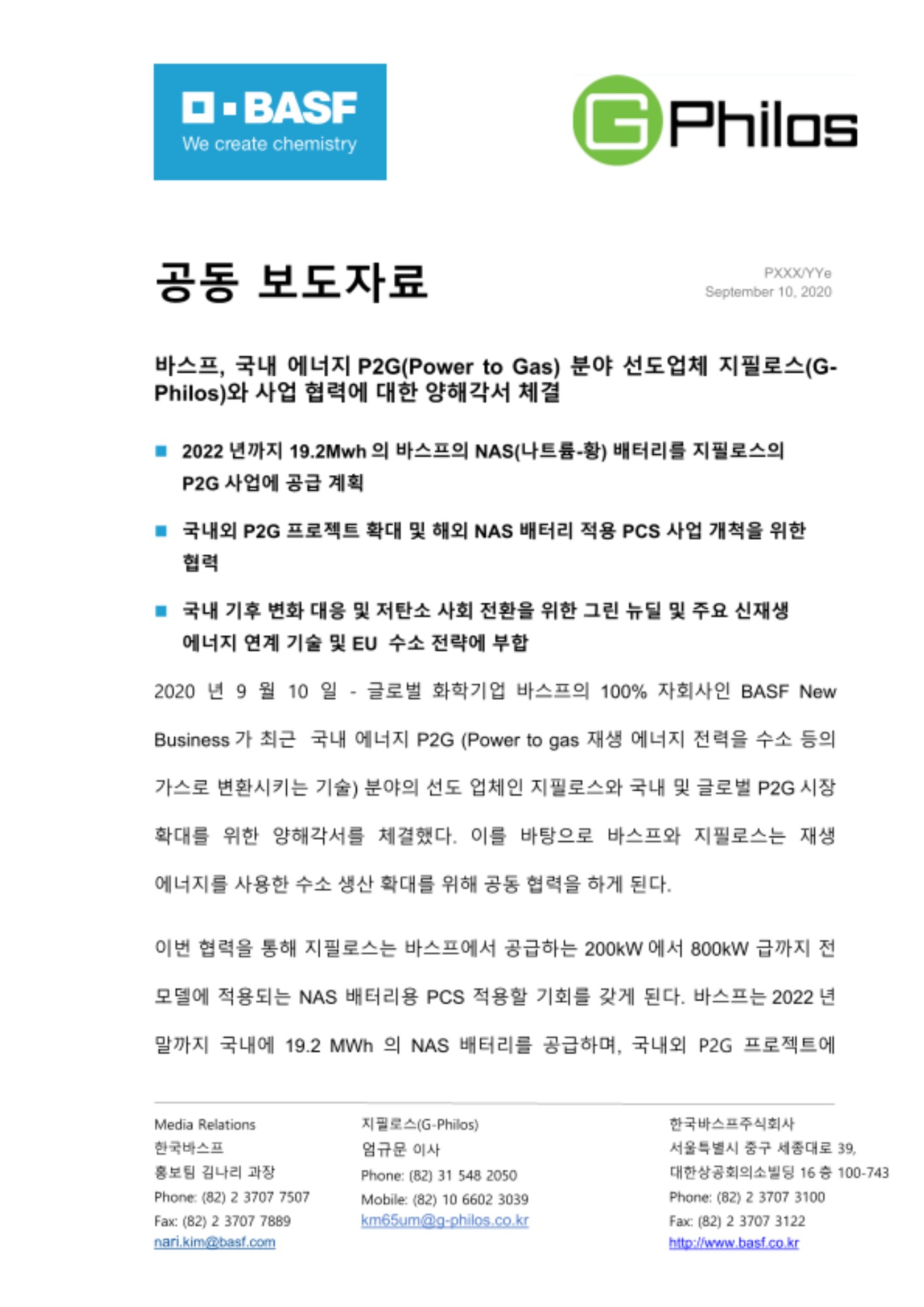 2020년 9월 10일 - 글로벌 화학기업 바스프의 100% 자회사인 BASF New Business가 최근 국내 에너지 P2G (Power to gas 재생 에너지 전력을 수소 등의 가스로 변환시키는 기술) 분야의 선도 업체인 지필로스와 국내 및 글로벌 P2G시장 확대를 위한 양해각서를 체결했다. 이를 바탕으로 바스프와 지필로스는 재생 에너지를 사용한 수소 생산 확대를 위해 공동 협력을 하게 된다.
