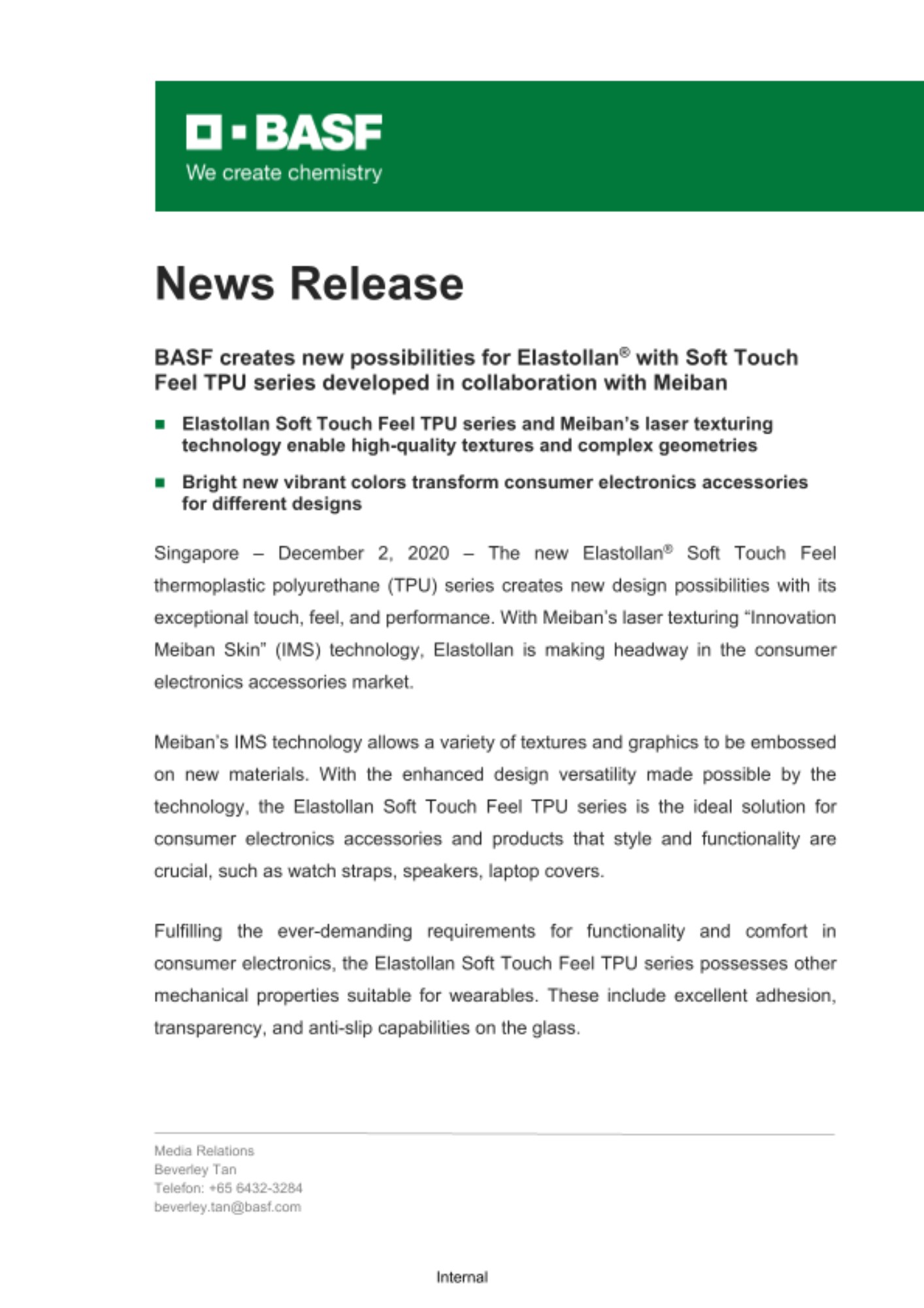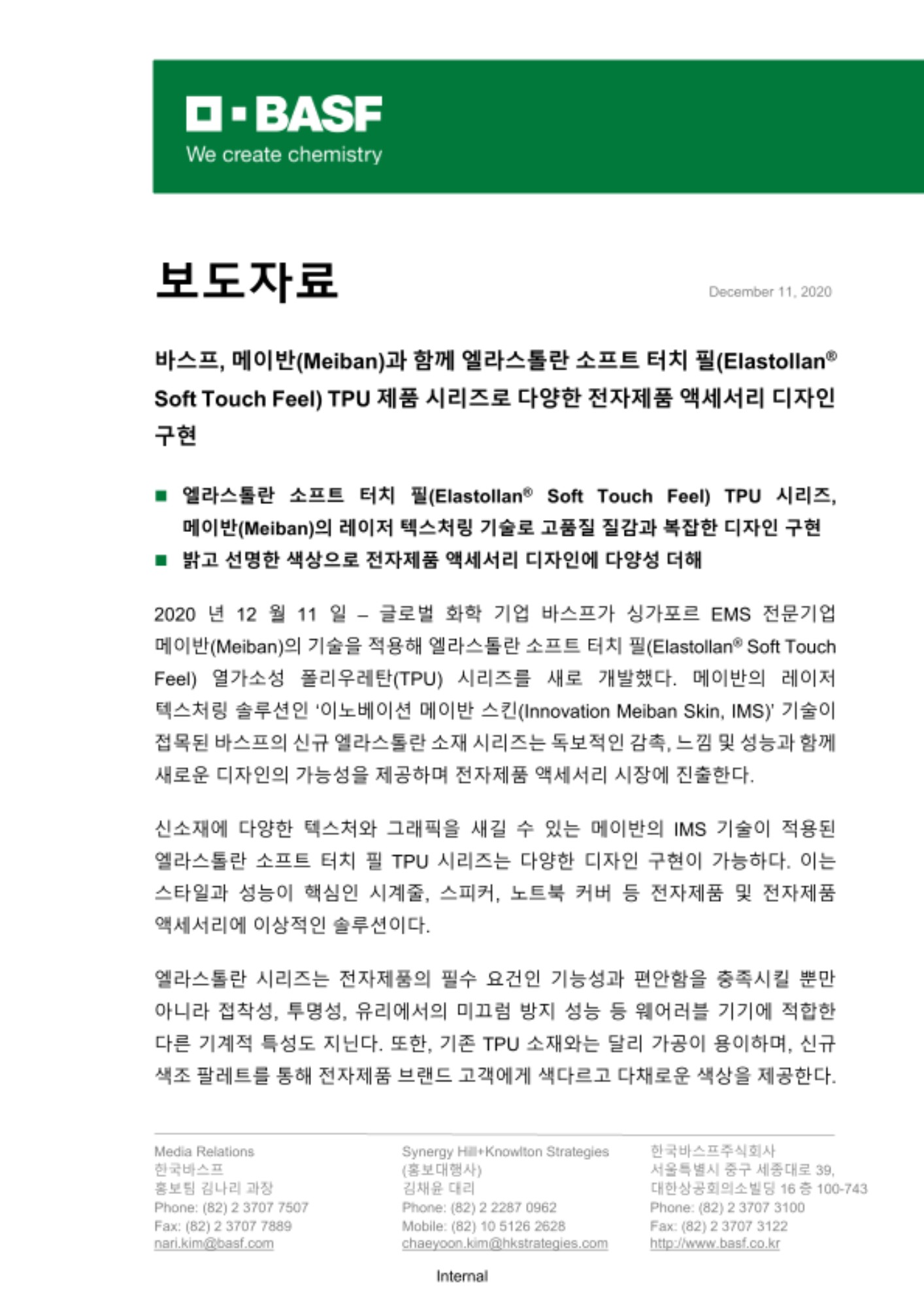 2020년 12월 11일 – 글로벌 화학 기업 바스프가 싱가포르 EMS 전문기업 메이반(Meiban)의 기술을 적용해 엘라스톨란 소프트 터치 필(Elastollan® Soft Touch Feel) 열가소성 폴리우레탄(TPU) 시리즈를 새로 개발했다. 메이반의 레이저 텍스처링 솔루션인 ‘이노베이션 메이반 스킨(Innovation Meiban Skin, IMS)’ 기술이 접목된 바스프의 신규 엘라스톨란 소재 시리즈는 독보적인 감촉, 느낌 및 성능과 함께 새로운 디자인의 가능성을 제공하며 전자제품 액세서리 시장에 진출한다.