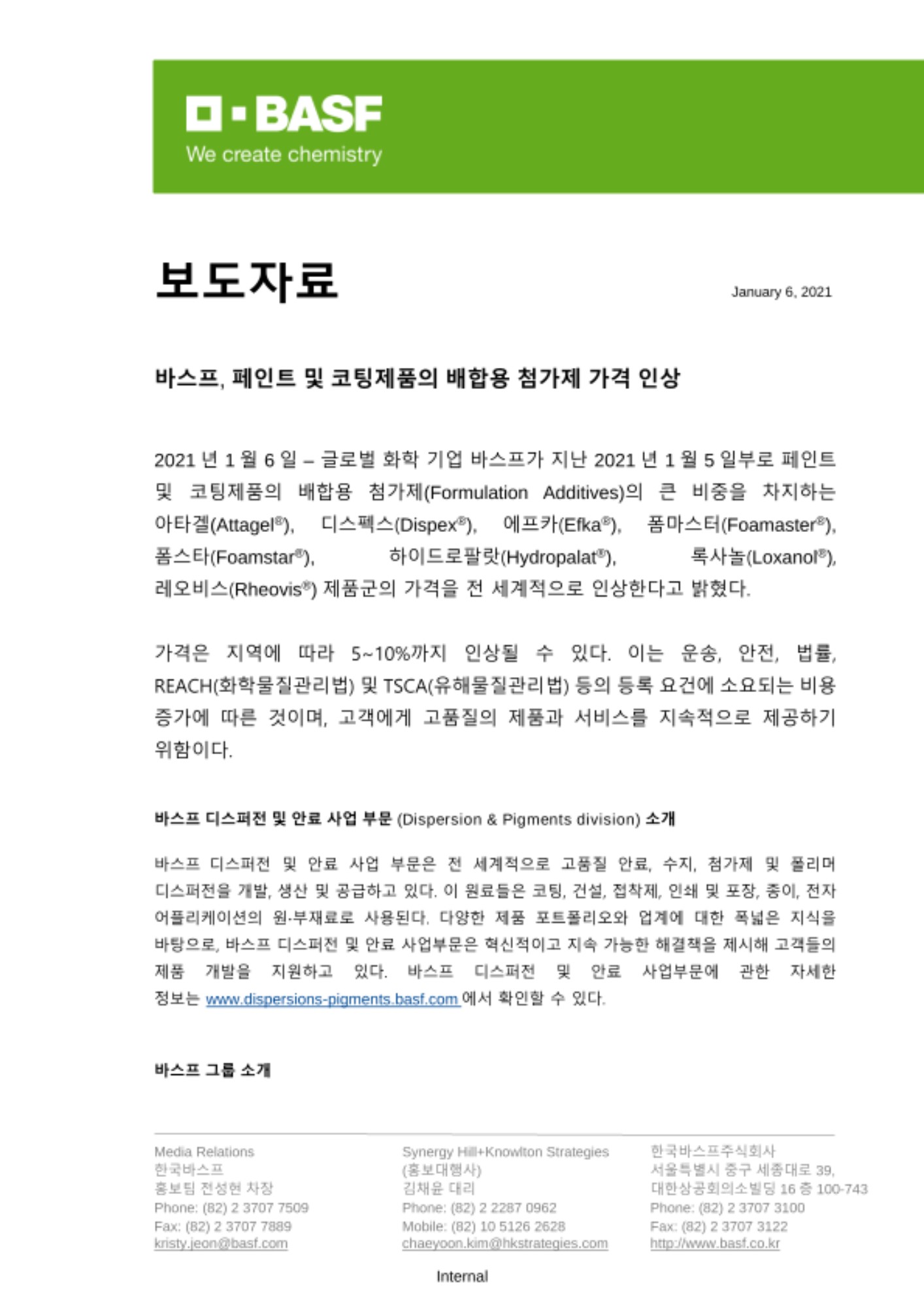 2021년 1월 6일 – 글로벌 화학 기업 바스프가 지난 2021년 1월 5일부로 페인트 및 코팅제품의 배합용 첨가제(Formulation Additives)의 큰 비중을 차지하는 아타겔(Attagel®), 디스펙스(Dispex®), 에프카(Efka®), 폼마스터(Foamaster®), 폼스타(Foamstar®), 하이드로팔랏(Hydropalat®), 록사놀(Loxanol®), 레오비스(Rheovis®) 제품군의 가격을 전 세계적으로 인상한다고 밝혔다.