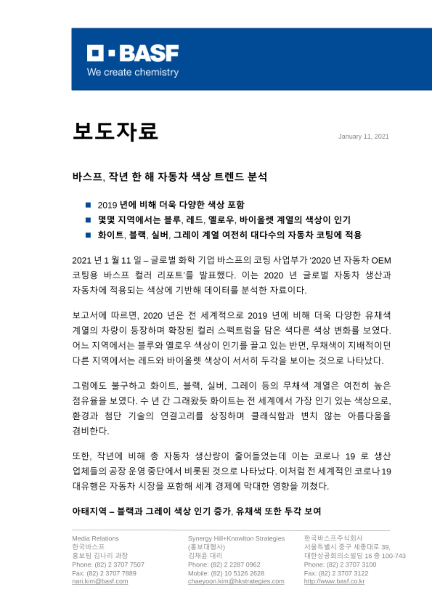 2021년 1월 11일 – 글로벌 화학 기업 바스프의 코팅 사업부가 ‘2020년 자동차 OEM 코팅용 바스프 컬러 리포트’를 발표했다. 이는 2020년 글로벌 자동차 생산과 자동차에 적용되는 색상에 기반해 데이터를 분석한 자료이다.