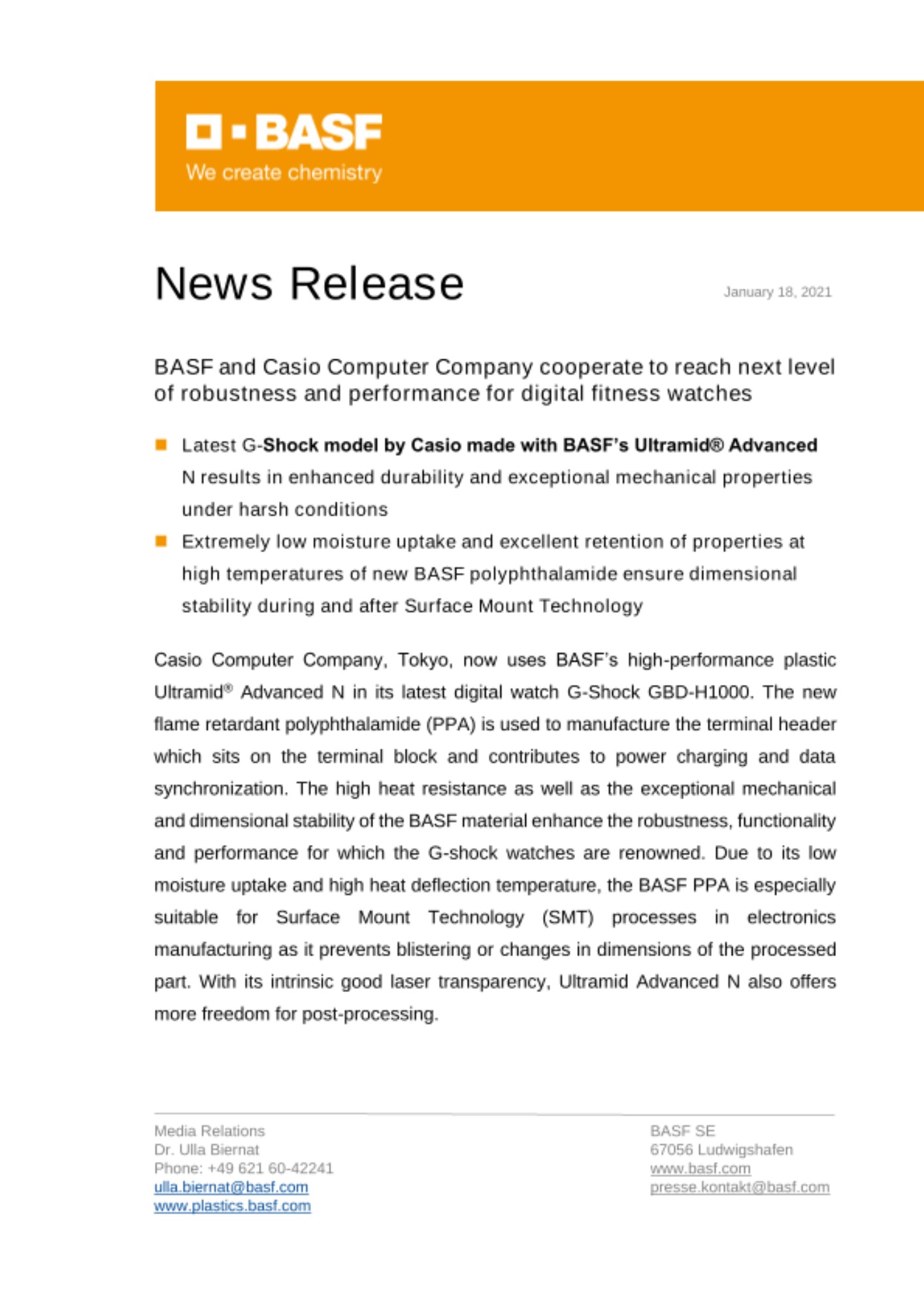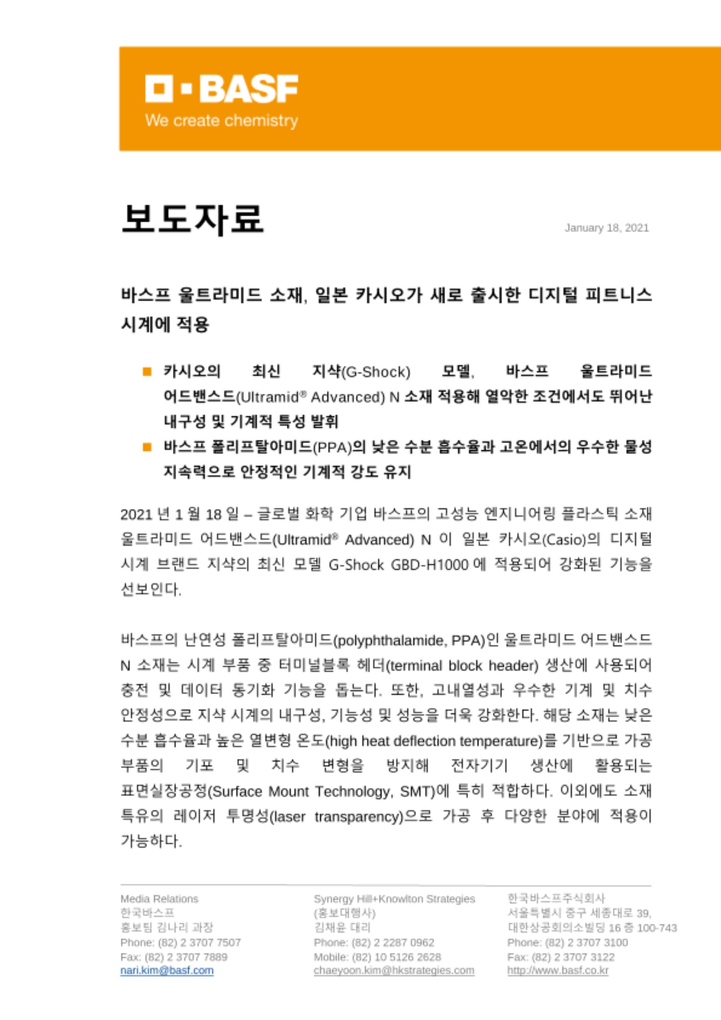 2021년 1월 18일 – 글로벌 화학 기업 바스프의 고성능 엔지니어링 플라스틱 소재 울트라미드 어드밴스드(Ultramid® Advanced) N이 일본 카시오(Casio)의 디지털 시계 브랜드 지샥의 최신 모델 G-Shock GBD-H1000에 적용되어 강화된 기능을 선보인다.