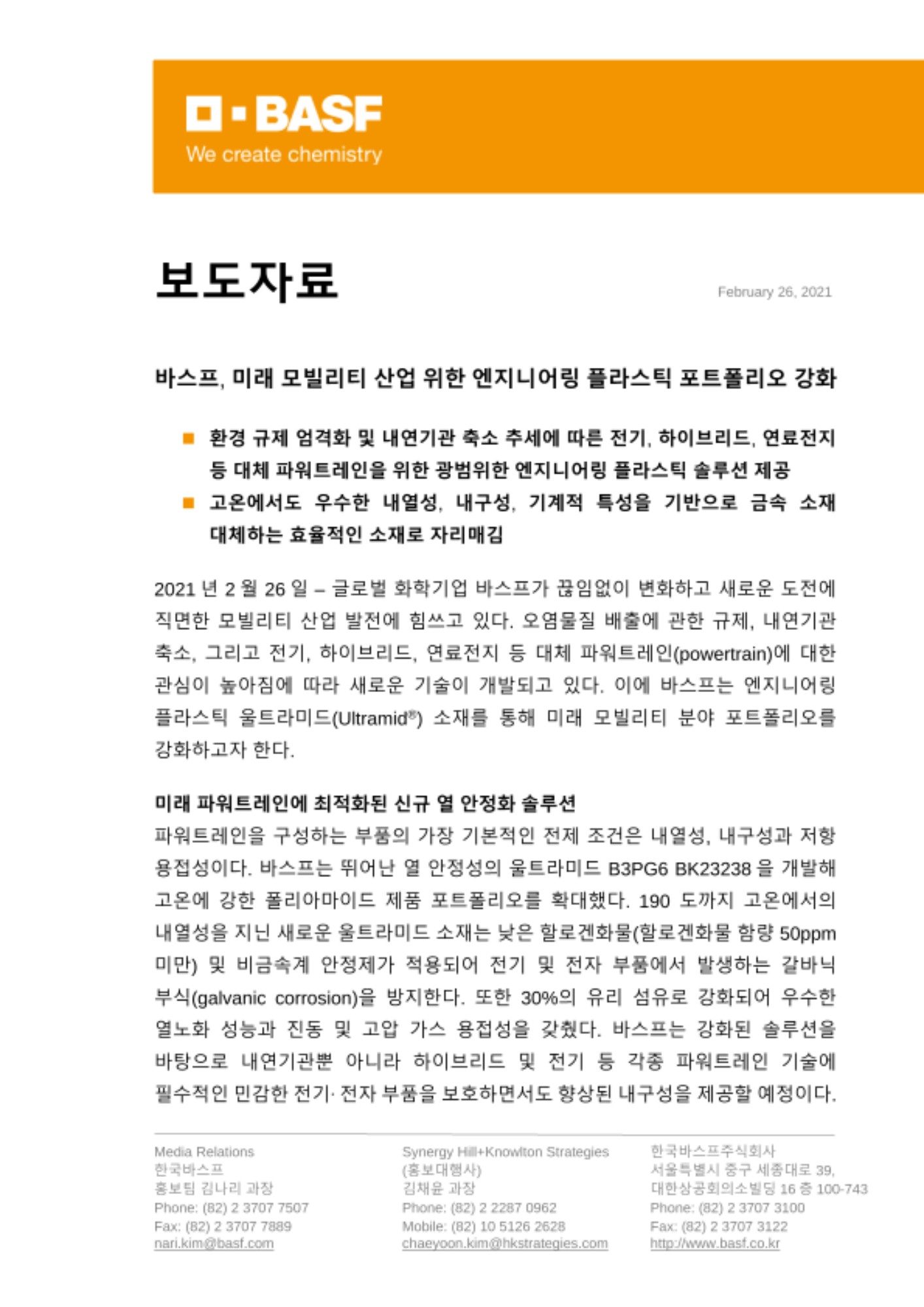2021년 2월 26일 – 글로벌 화학기업 바스프가 끊임없이 변화하고 새로운 도전에 직면한 모빌리티 산업 발전에 힘쓰고 있다. 오염물질 배출에 관한 규제, 내연기관 축소, 그리고 전기, 하이브리드, 연료전지 등 대체 파워트레인(powertrain)에 대한 관심이 높아짐에 따라 새로운 기술이 개발되고 있다. 이에 바스프는 엔지니어링 플라스틱 울트라미드(Ultramid®) 소재를 통해 미래 모빌리티 분야 포트폴리오를 강화하고자 한다.