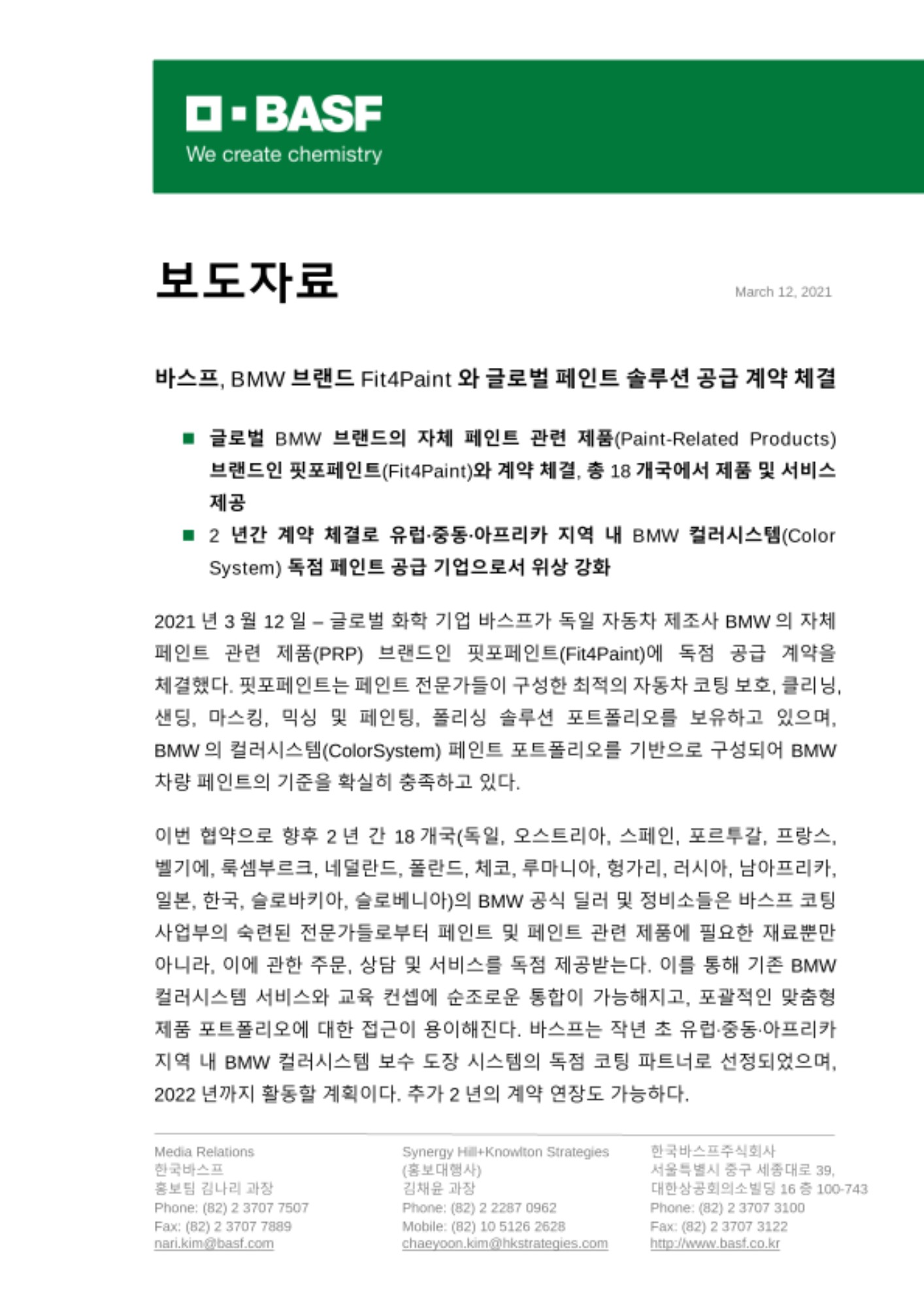 2021년 3월 12일 – 글로벌 화학 기업 바스프가 독일 자동차 제조사 BMW의 자체 페인트 관련 제품(PRP) 브랜드인 핏포페인트(Fit4Paint)에 독점 공급 계약을 체결했다. 핏포페인트는 페인트 전문가들이 구성한 최적의 자동차 코팅 보호, 클리닝, 샌딩, 마스킹, 믹싱 및 페인팅, 폴리싱 솔루션 포트폴리오를 보유하고 있으며, BMW의 컬러시스템(ColorSystem) 페인트 포트폴리오를 기반으로 구성되어 BMW 차량 페인트의 기준을 확실히 충족하고 있다.
