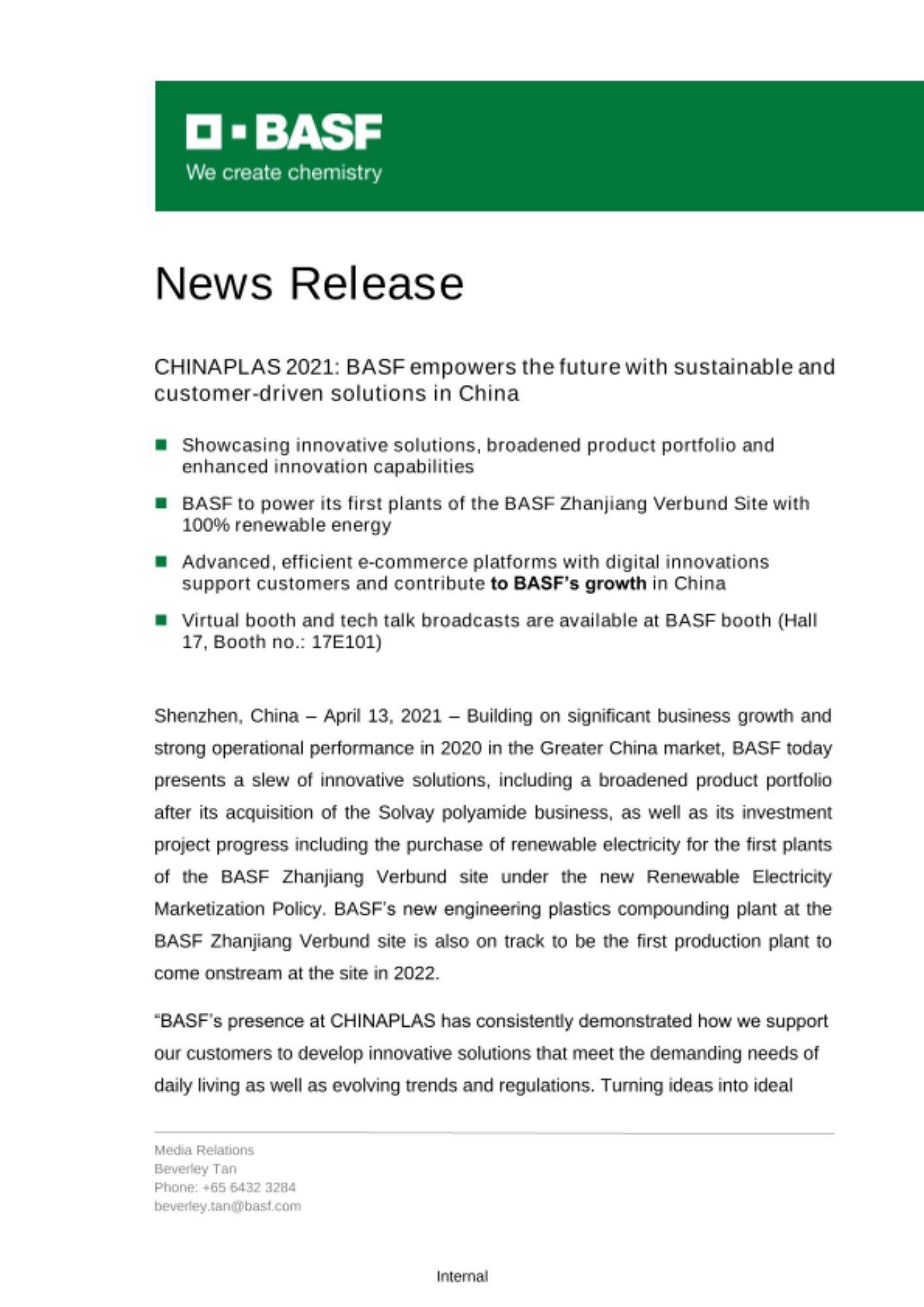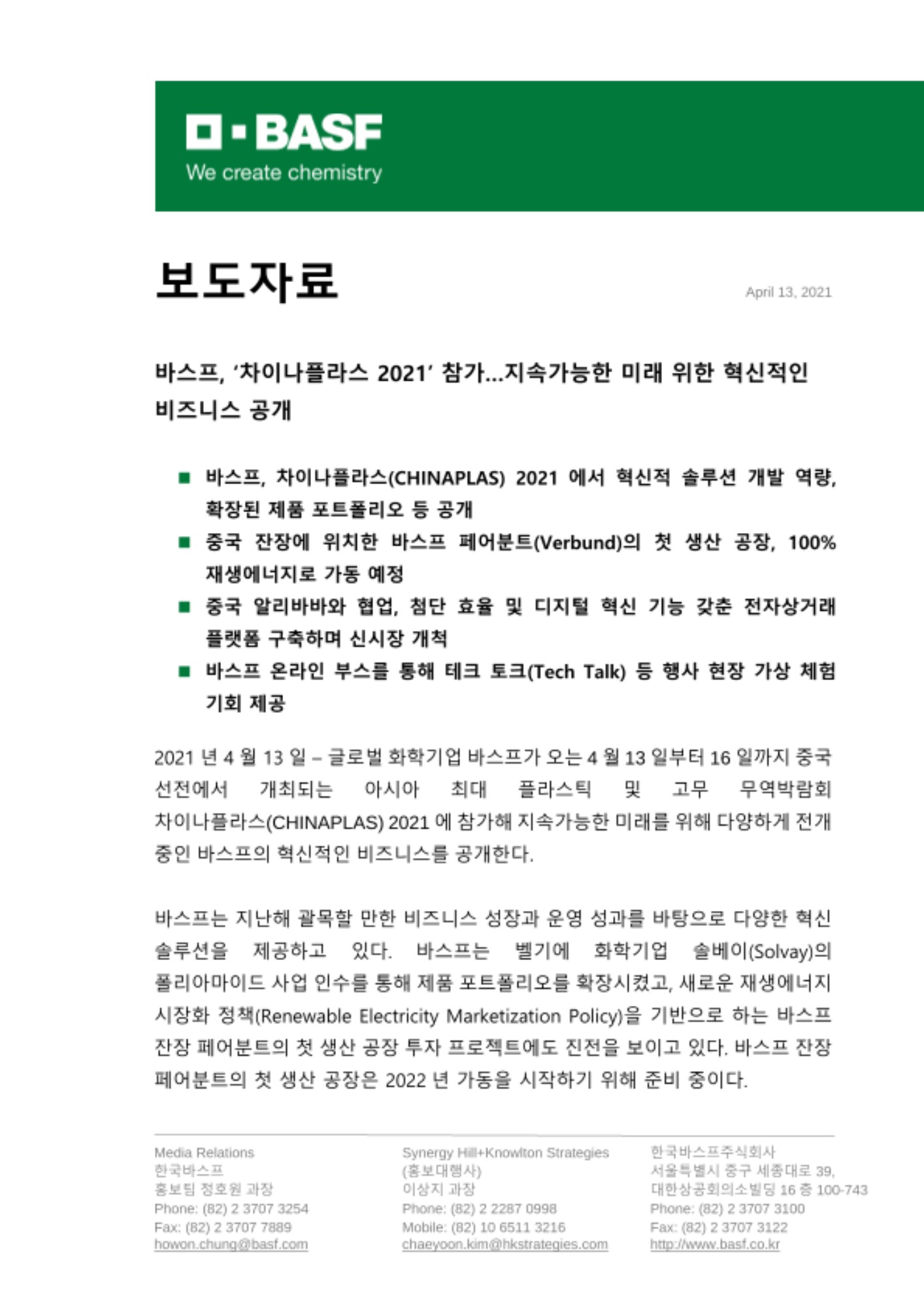 - 바스프, 차이나플라스(CHINAPLAS) 2021에서 혁신적 솔루션 개발 역량, 확장된 제품 포트폴리오 등 공개