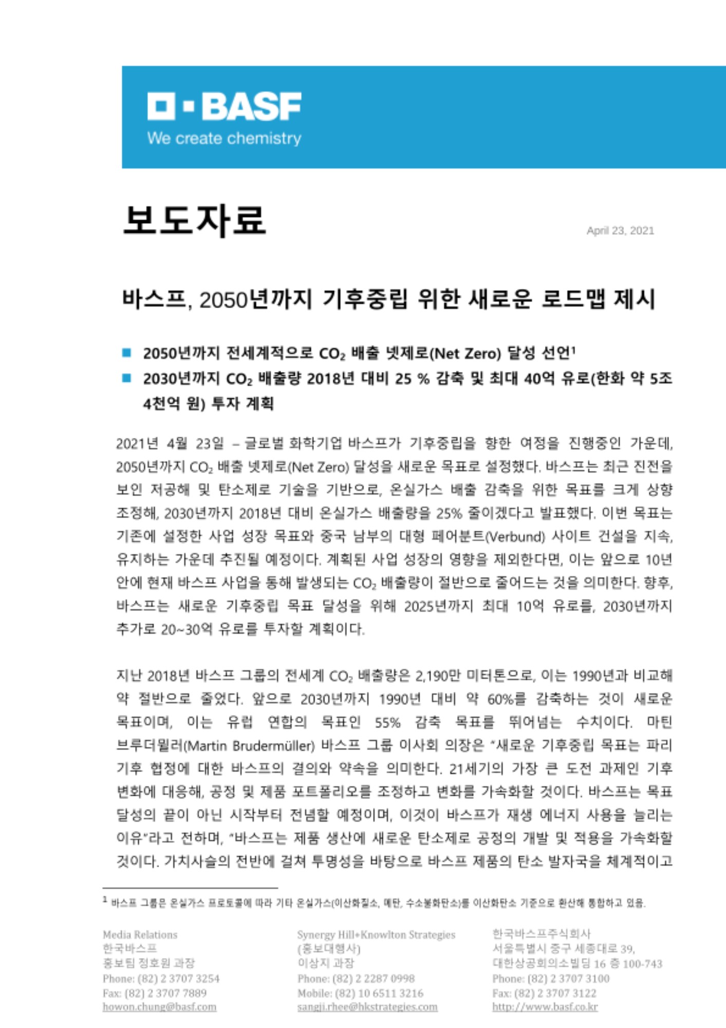 2021년 4월 23일 – 글로벌 화학기업 바스프가 기후중립을 향한 여정을 진행중인 가운데, 2050년까지 CO2 배출 넷제로(Net Zero) 달성을 새로운 목표로 설정했다. 바스프는 최근 진전을 보인 저공해 및 탄소제로 기술을 기반으로, 온실가스 배출 감축을 위한 목표를 크게 상향 조정해, 2030년까지 2018년 대비 온실가스 배출량을 25% 줄이겠다고 발표했다. 이번 목표는 기존에 설정한 사업 성장 목표와 중국 남부의 대형 페어분트(Verbund) 사이트 건설을 지속, 유지하는 가운데 추진될 예정이다. 계획된 사업 성장의 영향을 제외한다면, 이는 앞으로 10년 안에 현재 바스프 사업을 통해 발생되는 CO2 배출량이 절반으로 줄어드는 것을 의미한다. 향후, 바스프는 새로운 기후중립 목표 달성을 위해 2025년까지 최대 10억 유로를, 2030년까지 추가로 20~30억 유로를 투자할 계획이다.