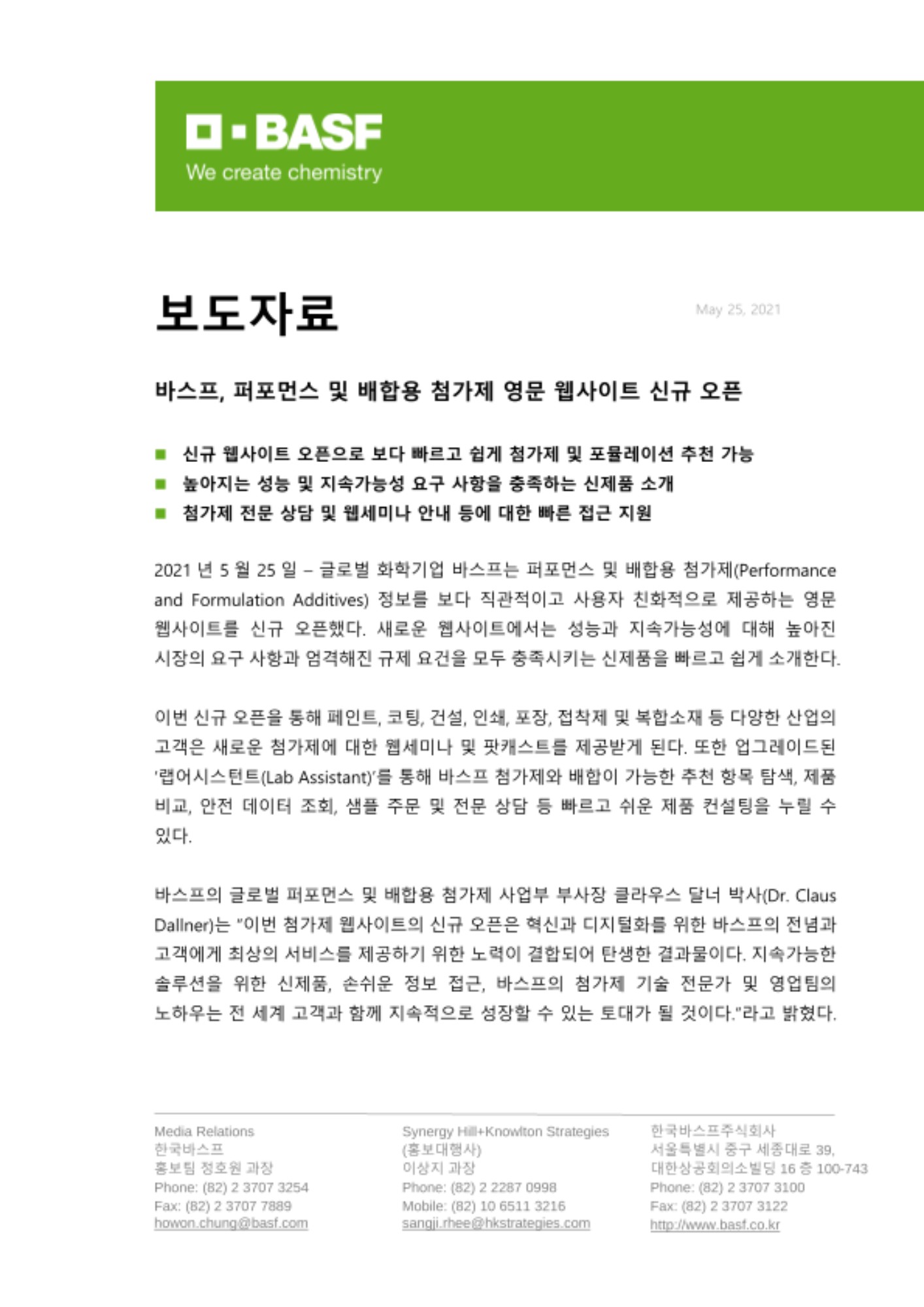 바스프, 퍼포먼스 및 배합용 첨가제 영문 웹사이트 신규 오픈