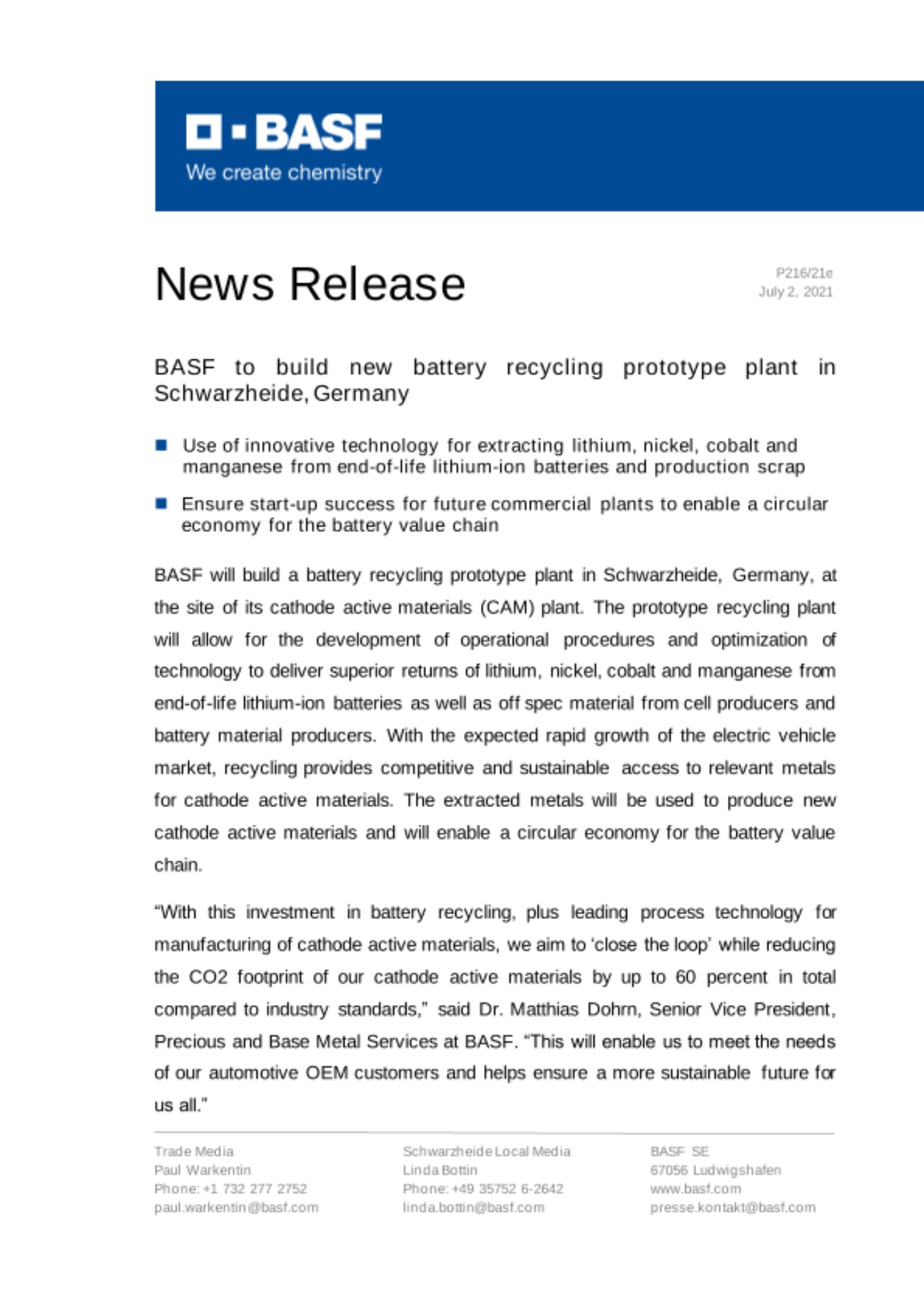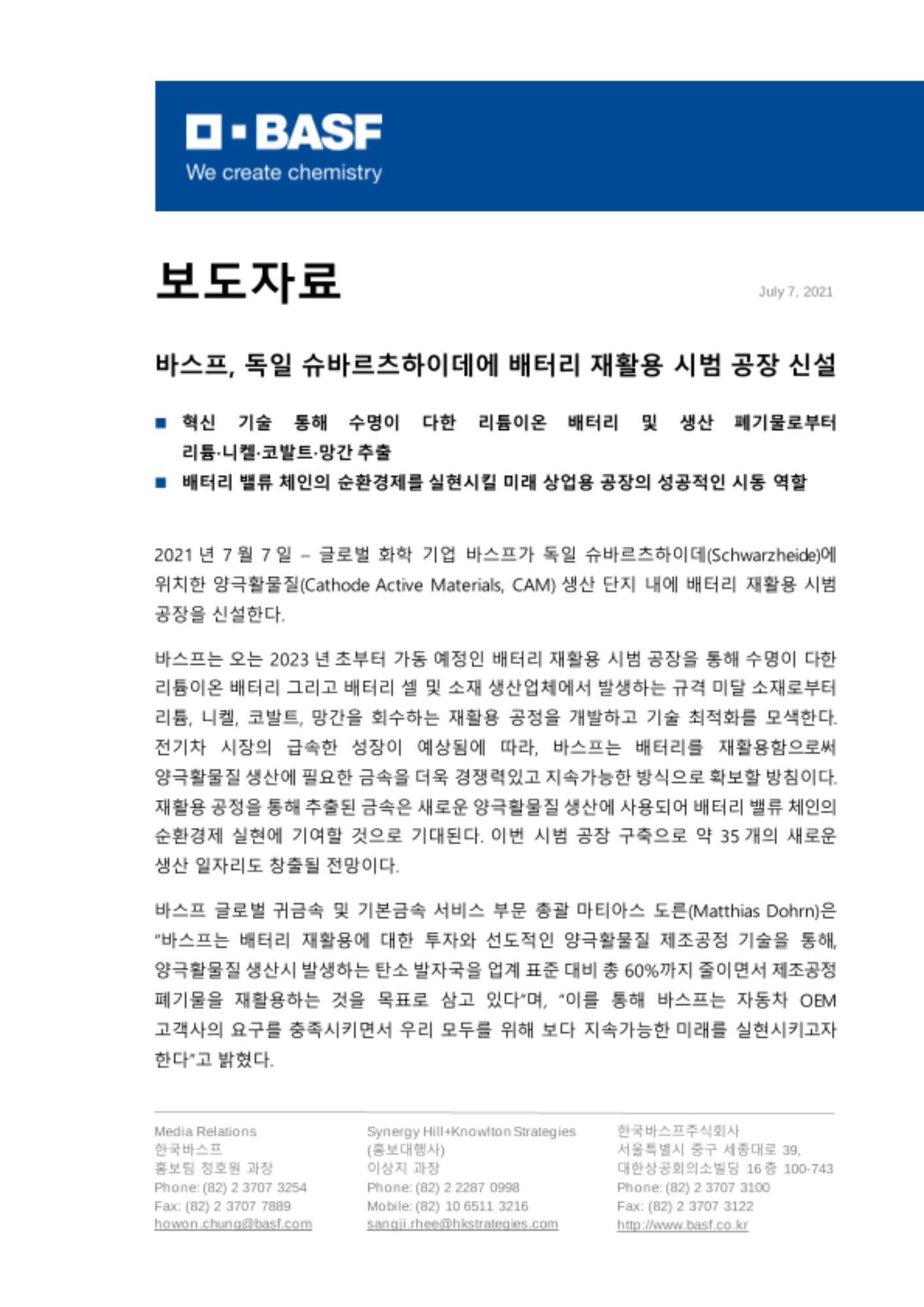 2021년 7월 7일 – 글로벌 화학 기업 바스프가 독일 슈바르츠하이데(Schwarzheide)에 위치한 양극활물질(Cathode Active Materials, CAM) 생산 단지 내에 배터리 재활용 시범 공장을 신설한다.