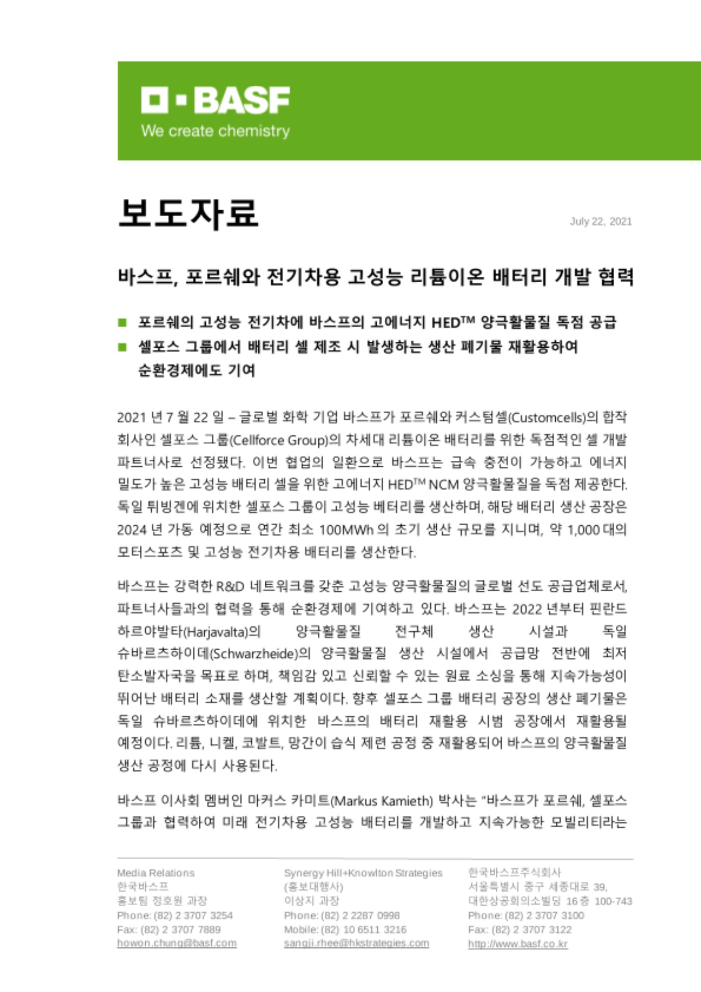 2021년 7월 22일 – 글로벌 화학 기업 바스프가 포르쉐와 커스텀셀(Customcells)의 합작 회사인 셀포스 그룹(Cellforce Group)의 차세대 리튬이온 배터리를 위한 독점적인 셀 개발 파트너사로 선정됐다. 이번 협업의 일환으로 바스프는 급속 충전이 가능하고 에너지 밀도가 높은 고성능 배터리 셀을 위한 고에너지 HEDTM NCM 양극활물질을 독점 제공한다. 독일 튀빙겐에 위치한 셀포스 그룹이 고성능 베터리를 생산하며, 해당 배터리 생산 공장은 2024년 가동 예정으로 연간 최소 100MWh의 초기 생산 규모를 지니며, 약 1,000대의 모터스포츠 및 고성능 전기차용 배터리를 생산한다.