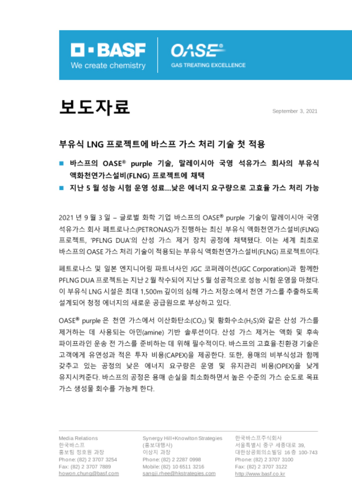 2021년 9월 3일 – 글로벌 화학 기업 바스프의 OASE® purple 기술이 말레이시아 국영 석유가스 회사 페트로나스(PETRONAS)가 진행하는 최신 부유식 액화천연가스설비(FLNG) 프로젝트, ‘PFLNG DUA’의 산성 가스 제거 장치 공정에 채택됐다. 이는 세계 최초로 바스프의 OASE 가스 처리 기술이 적용되는 부유식 액화천연가스설비(FLNG) 프로젝트이다.
