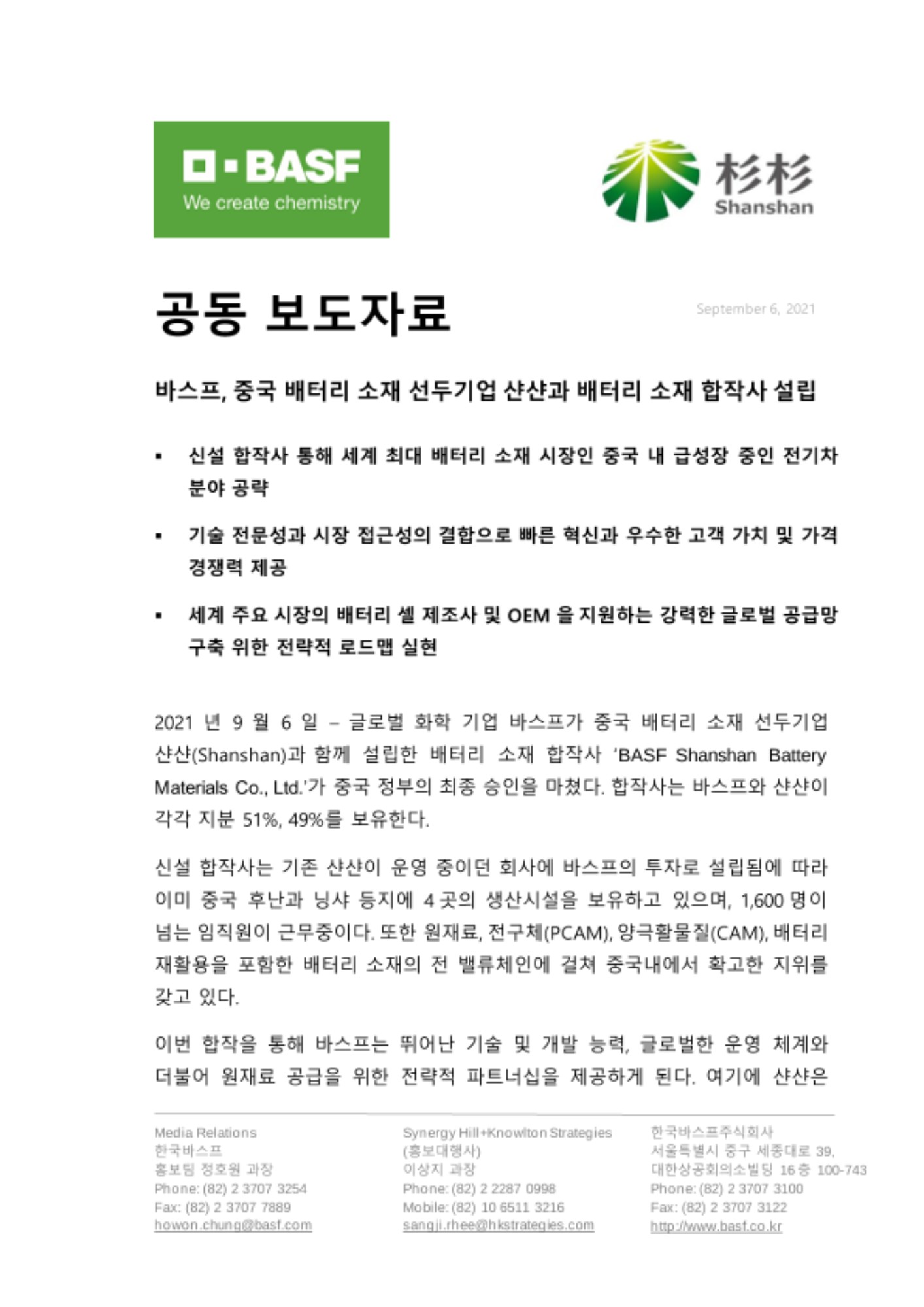 2021년 9월 6일 – 글로벌 화학 기업 바스프가 중국 배터리 소재 선두기업 샨샨(Shanshan)과 함께 설립한 배터리 소재 합작사 ‘BASF Shanshan Battery Materials Co., Ltd.’가 중국 정부의 최종 승인을 마쳤다. 합작사는 바스프와 샨샨이 각각 지분 51%, 49%를 보유한다.