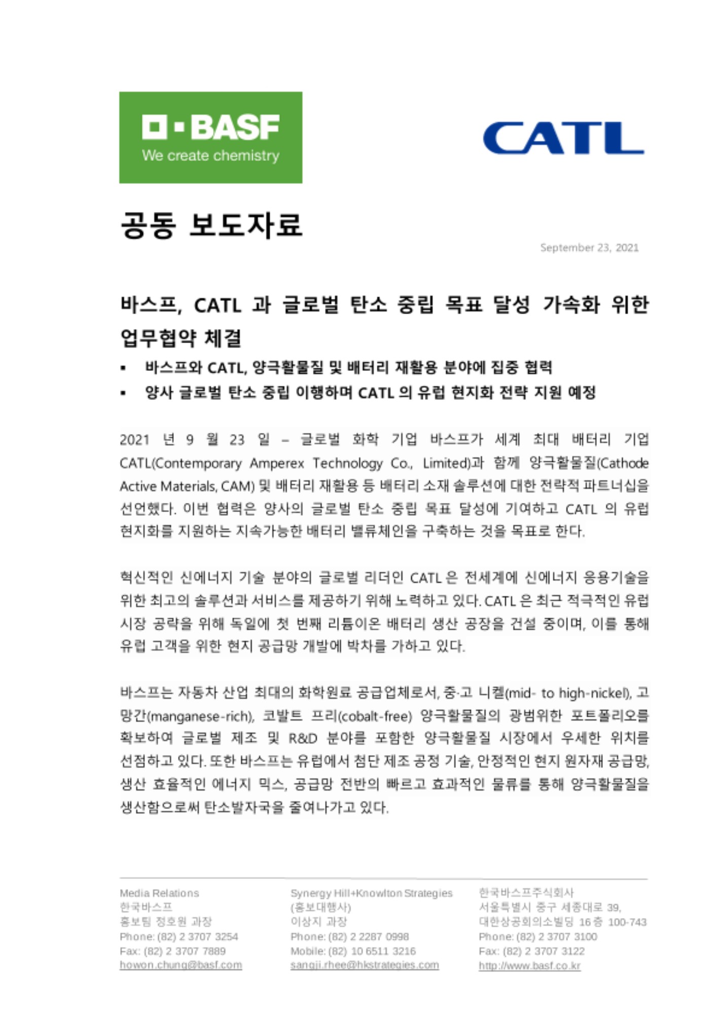 2021년 9월 23일 – 글로벌 화학 기업 바스프가 세계 최대 배터리 기업 CATL(Contemporary Amperex Technology Co., Limited)과 함께 양극활물질(Cathode Active Materials, CAM) 및 배터리 재활용 등 배터리 소재 솔루션에 대한 전략적 파트너십을 선언했다. 이번 협력은 양사의 글로벌 탄소 중립 목표 달성에 기여하고 CATL의 유럽 현지화를 지원하는 지속가능한 배터리 밸류체인을 구축하는 것을 목표로 한다.