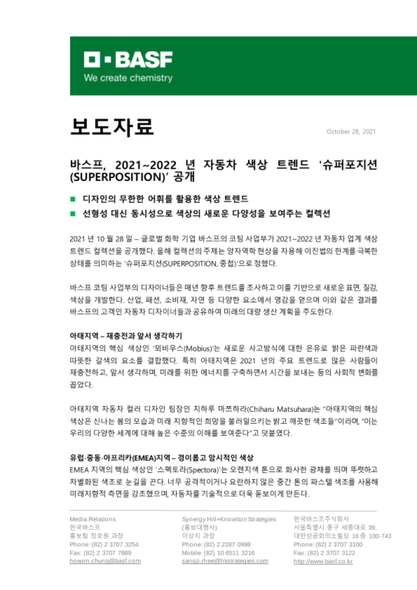 2021년 10월 28일 – 글로벌 화학 기업 바스프의 코팅 사업부가 2021~2022년 자동차 업계 색상 트렌드 컬렉션을 공개했다. 올해 컬렉션의 주제는 양자역학 현상을 차용해 이진법의 한계를 극복한 상태를 의미하는 '슈퍼포지션(SUPERPOSITION, 중첩)‘으로 정했다.