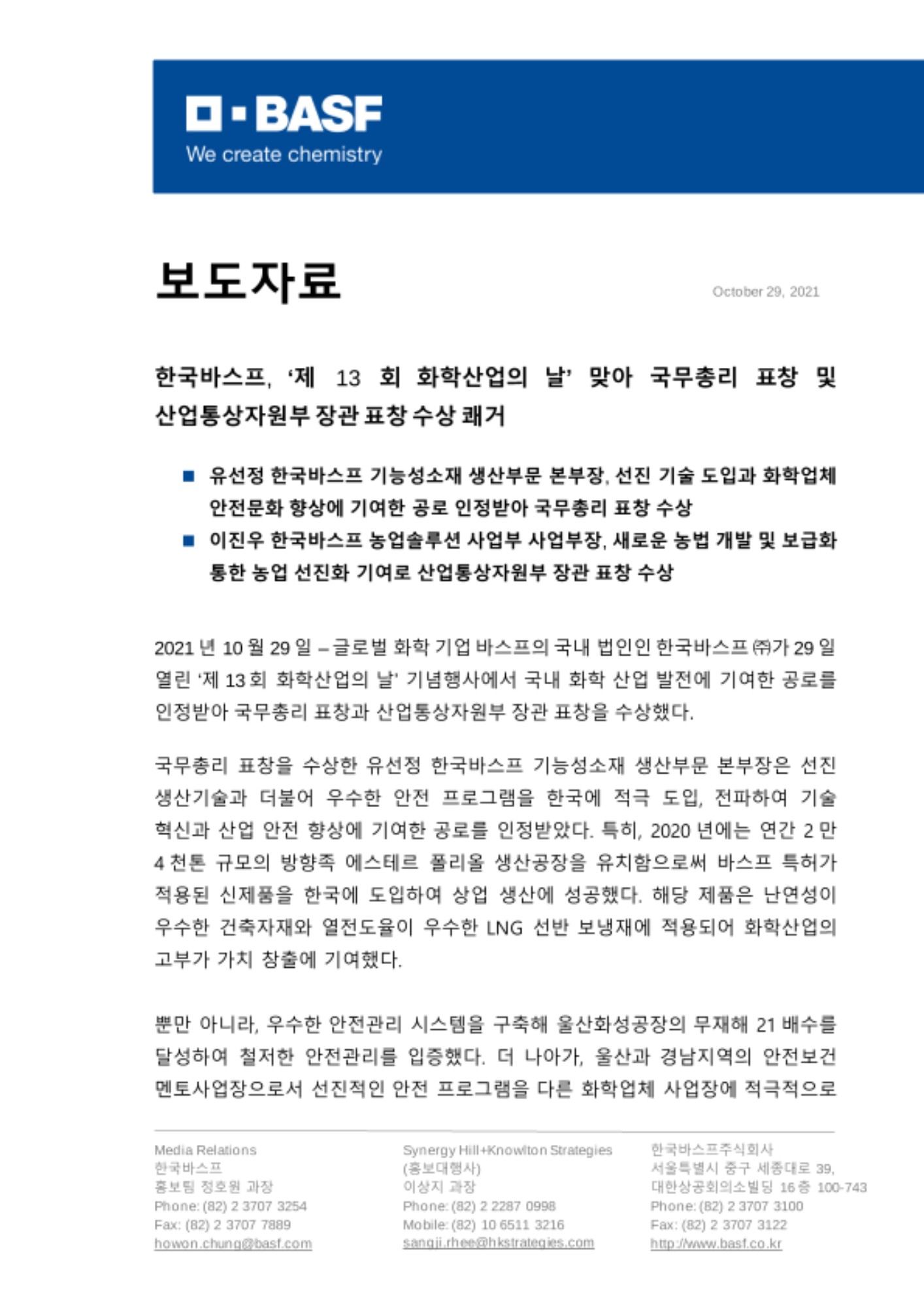 2021년 10월29일 – 글로벌 화학 기업 바스프의 국내 법인인 한국바스프 ㈜가 29일 열린 ‘제13회 화학산업의 날’ 기념행사에서 국내 화학 산업 발전에 기여한 공로를 인정받아 국무총리 표창과 산업통상자원부 장관 표창을 수상했다.