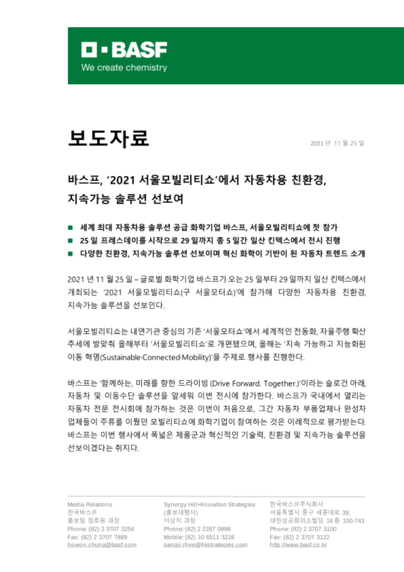 2021년 11월 25일 – 글로벌 화학기업 바스프가 오는 25일부터 29일까지 일산 킨텍스에서 개최되는 ‘2021 서울모빌리티쇼(구 서울모터쇼)’에 참가해 다양한 자동차용 친환경, 지속가능 솔루션을 선보인다.