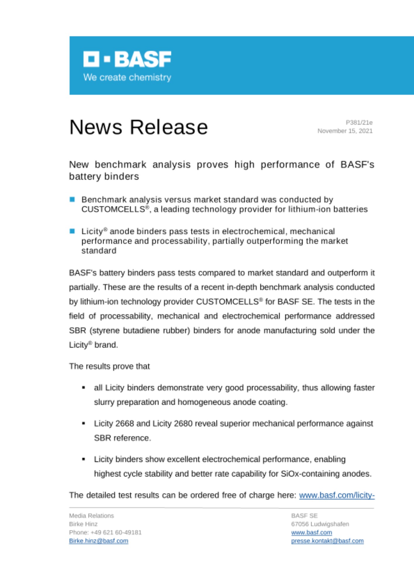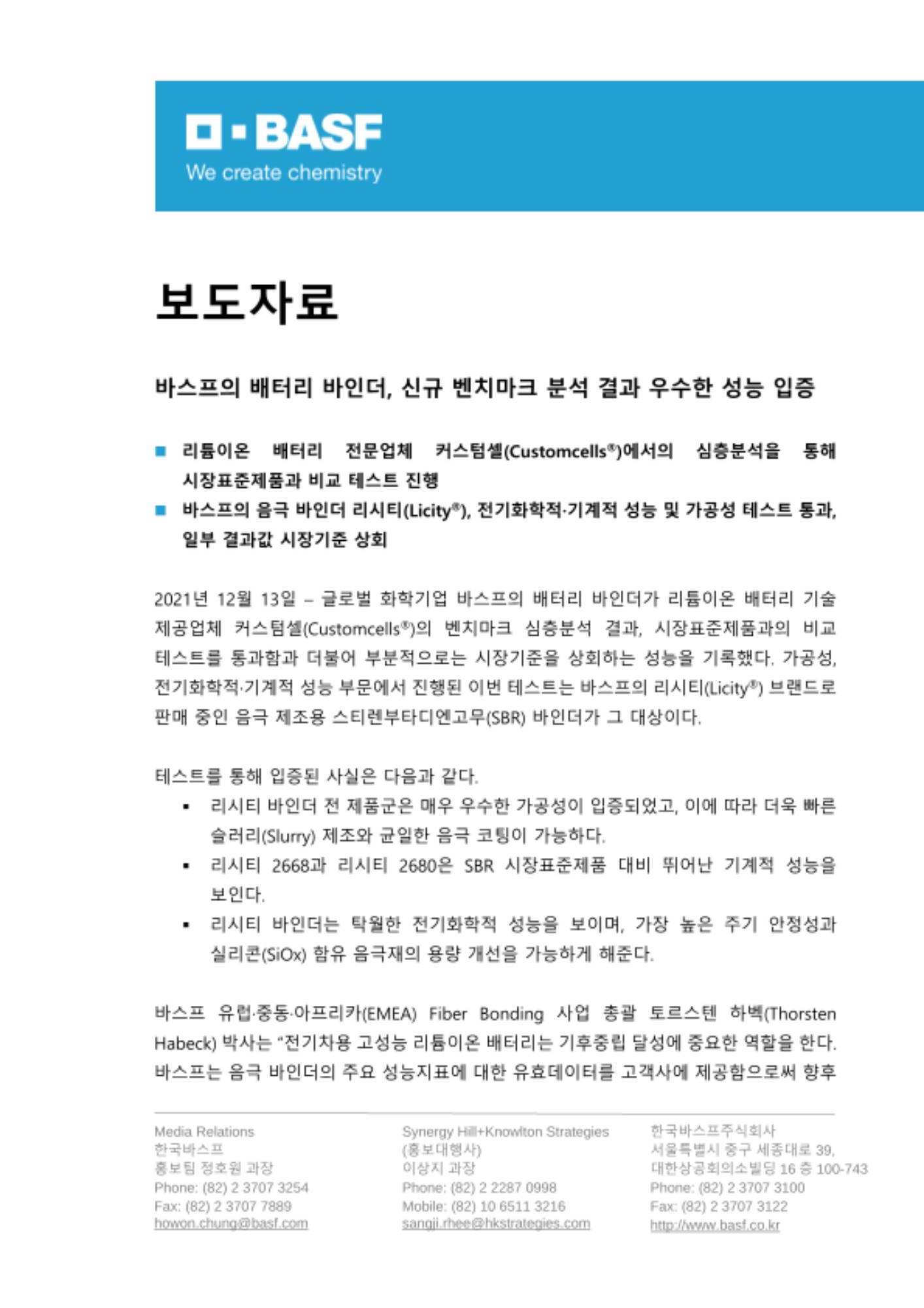 2021년 12월 13일 – 글로벌 화학기업 바스프의 배터리 바인더가 리튬이온 배터리 기술 제공업체 커스텀셀(Customcells®)의 벤치마크 심층분석 결과, 시장표준제품과의 비교 테스트를 통과함과 더불어 부분적으로는 시장기준을 상회하는 성능을 기록했다. 가공성, 전기화학적·기계적 성능 부문에서 진행된 이번 테스트는 바스프의 리시티(Licity®) 브랜드로 판매 중인 음극 제조용 스티렌부타디엔고무(SBR) 바인더가 그 대상이다.