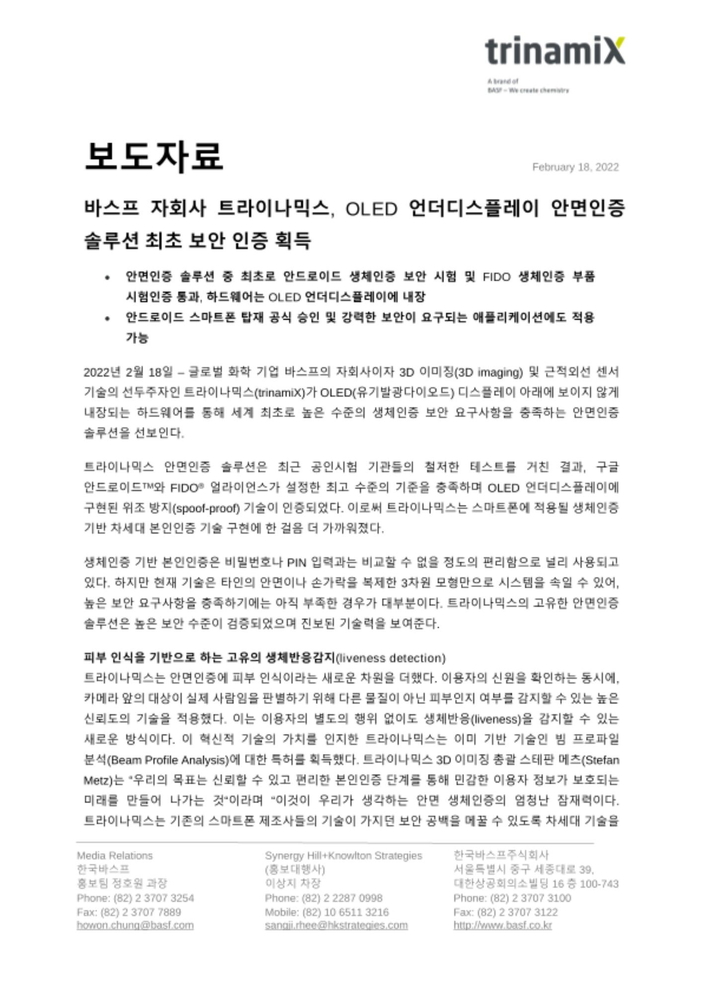 2022년 2월 18일 - 글로벌 화학 기업 바스프의 자회사이자 3D 이미징(3D imaging) 및 근적외선 센서기술의 선두주자인 트라이나믹스(trinamiX)가 OLED(유기발광다이오드) 디스플레이 아래에 보이지 않게 내장되는 하드웨어를 통해 세계 최초로 높은 수준의 생체인증 보안 요구사항을 충족하는 안면인증 솔루션을 선보인다.