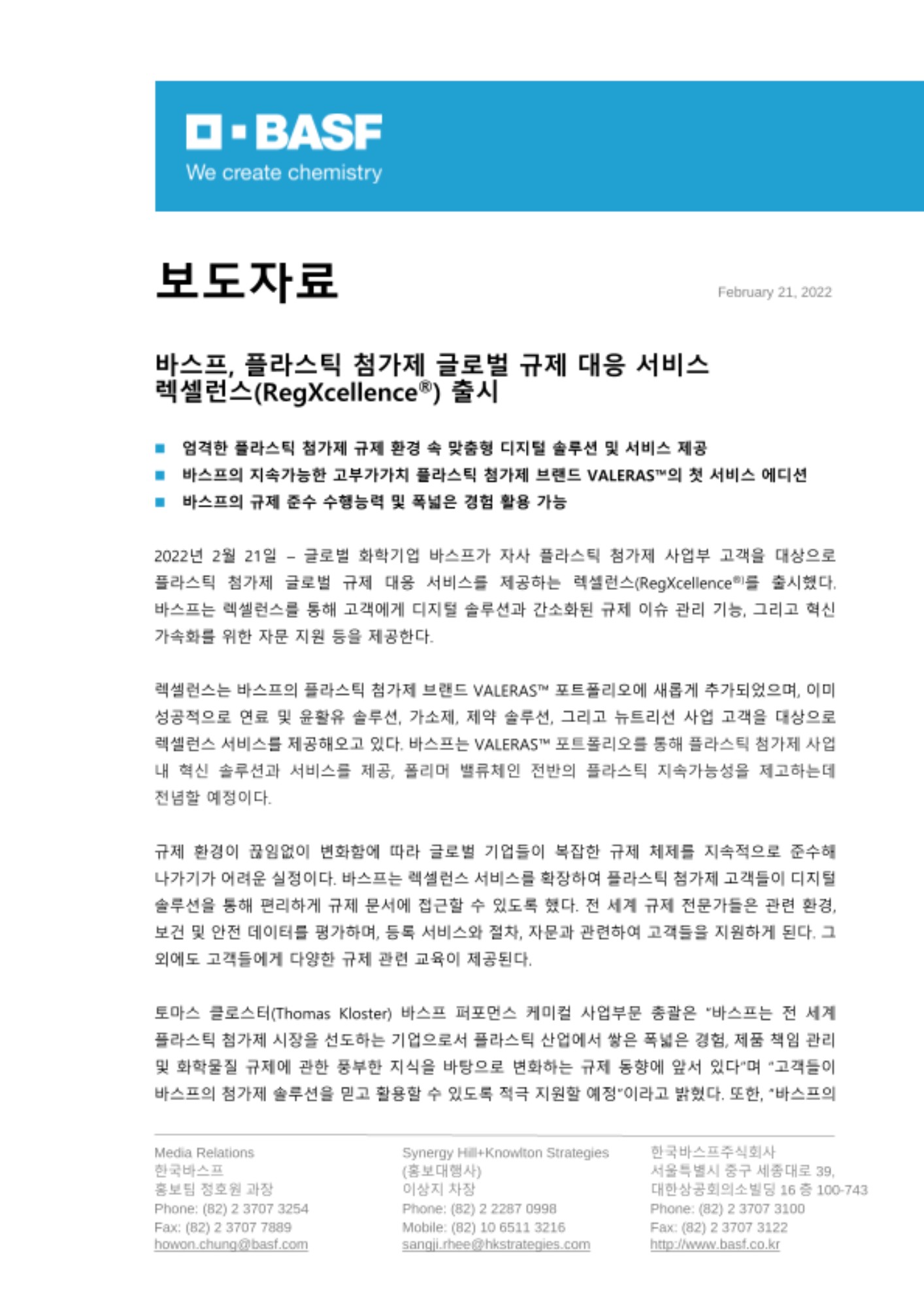 2022년 2월 21일 – 글로벌 화학기업 바스프가 자사 플라스틱 첨가제 사업부 고객을 대상으로 플라스틱 첨가제 글로벌 규제 대응 서비스를 제공하는 렉셀런스(RegXcellence®)를 출시했다. 바스프는 렉셀런스를 통해 고객에게 디지털 솔루션과 간소화된 규제 이슈 관리 기능, 그리고 혁신 가속화를 위한 자문 지원 등을 제공한다.