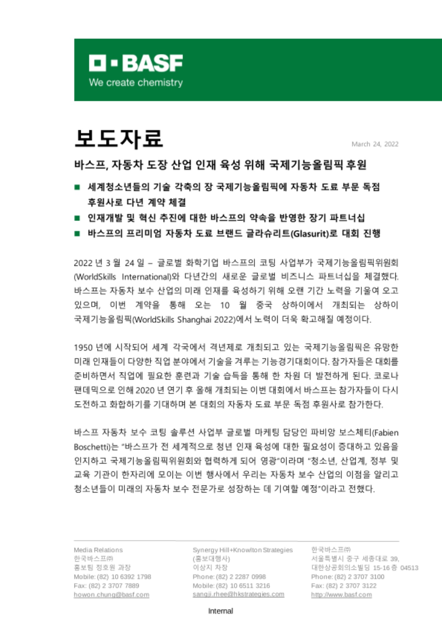 2022년 3월 24일 – 글로벌 화학기업 바스프의 코팅 사업부가 국제기능올림픽위원회 (WorldSkills International)와 다년간의 새로운 글로벌 비즈니스 파트너십을 체결했다. 바스프는 자동차 보수 산업의 미래 인재를 육성하기 위해 오랜 기간 노력을 기울여 오고 있으며, 이번 계약을 통해 오는 10월 중국 상하이에서 개최되는 상하이 국제기능올림픽(WorldSkills Shanghai 2022)에서 노력이 더욱 확고해질 예정이다.