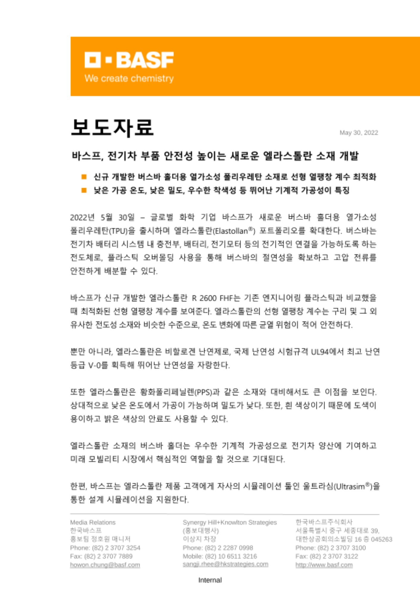 2022년 5월 30일 – 글로벌 화학 기업 바스프가 새로운 버스바 홀더용 열가소성 폴리우레탄(TPU)을 출시하며 엘라스톨란(Elastollan®) 포트폴리오를 확대한다. 버스바는 전기차 배터리 시스템 내 충전부, 배터리, 전기모터 등의 전기적인 연결을 가능하도록 하는 전도체로, 플라스틱 오버몰딩 사용을 통해 버스바의 절연성을 확보하고 고압 전류를 안전하게 배분할 수 있다.