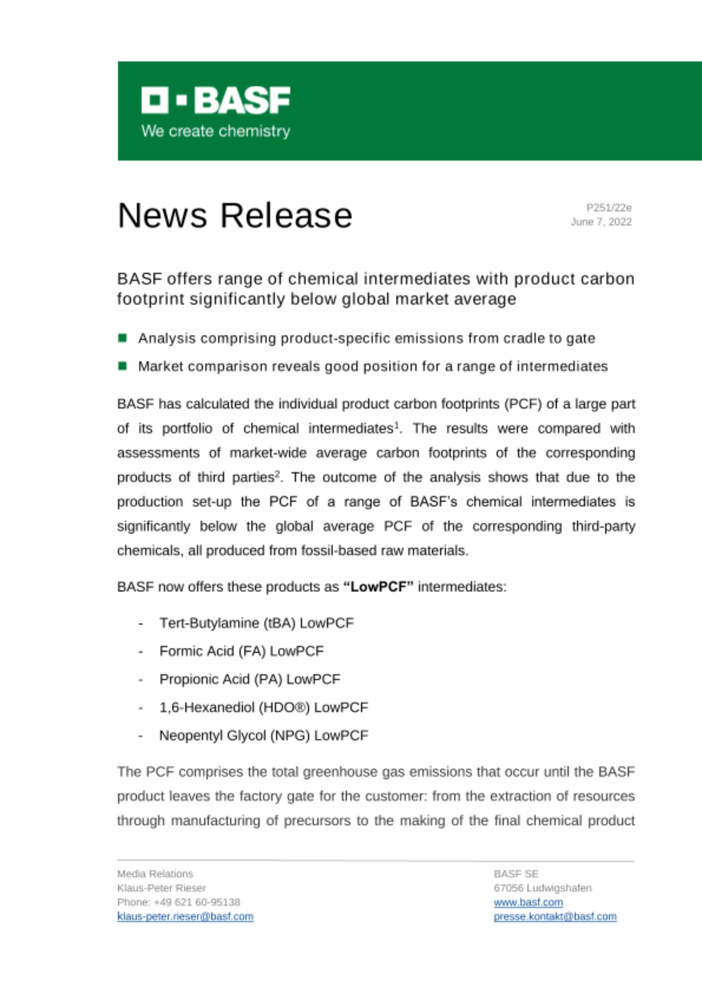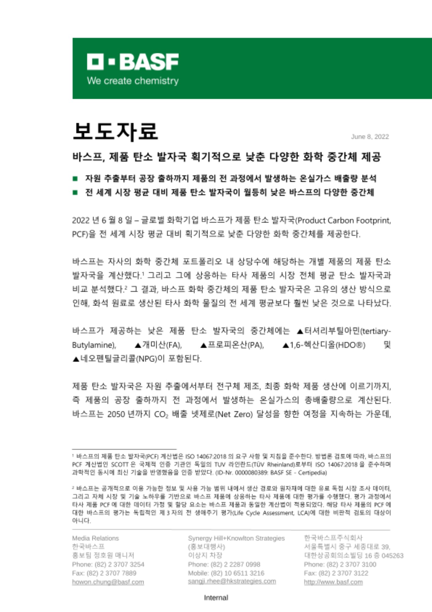 2022년 6월 8일 – 글로벌 화학기업 바스프가 제품 탄소 발자국(Product Carbon Footprint, PCF)을 전 세계 시장 평균 대비 획기적으로 낮춘 다양한 화학 중간체를 제공한다.