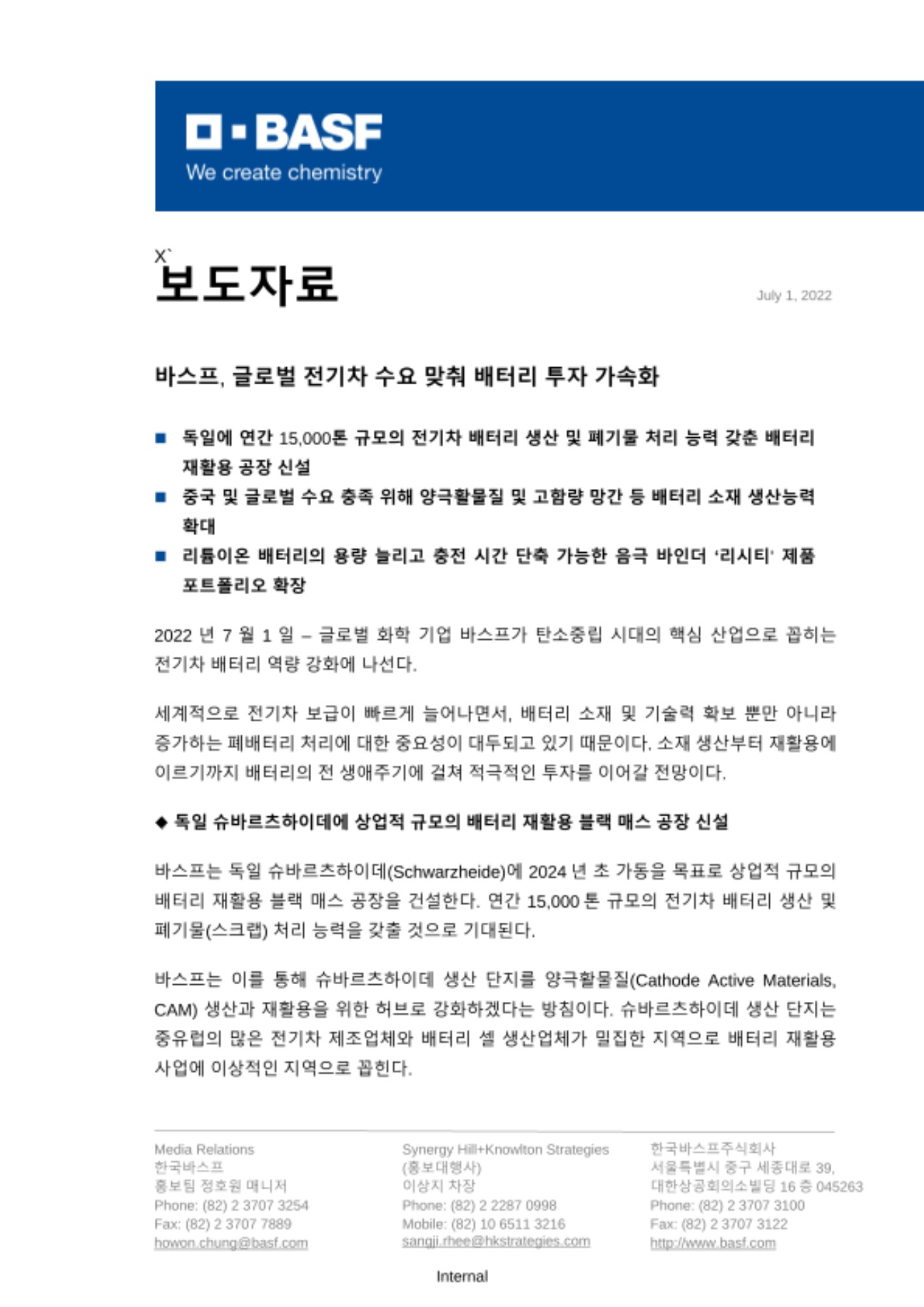 2022년 7월 1일 – 글로벌 화학 기업 바스프가 탄소중립 시대의 핵심 산업으로 꼽히는 전기차 배터리 역량 강화에 나선다.