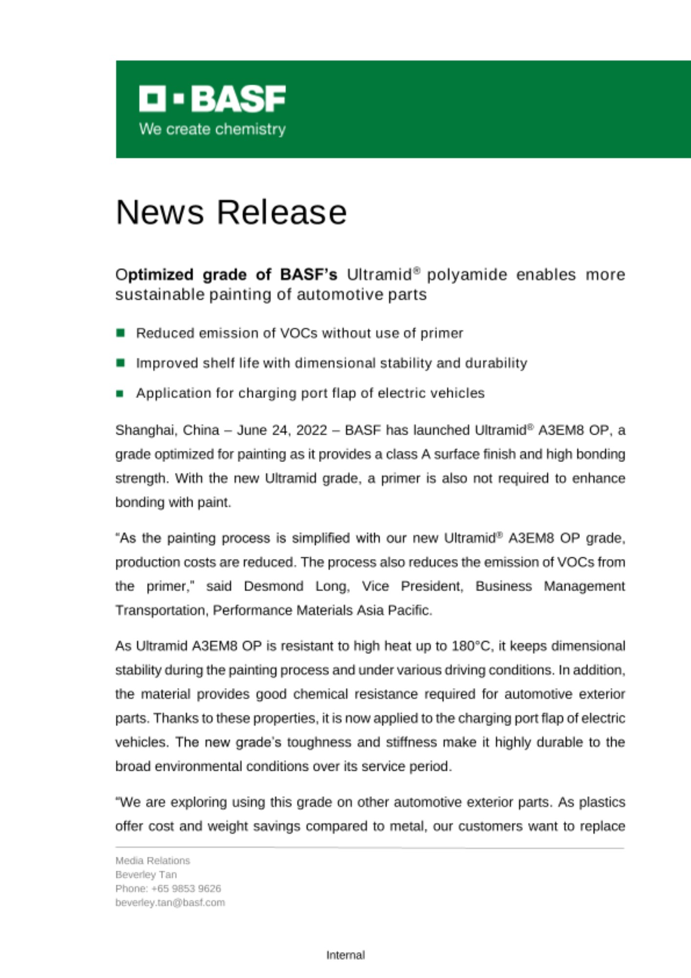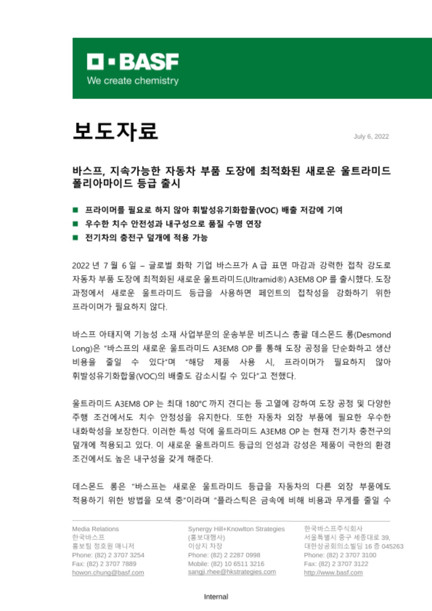 바스프 아태지역 기능성 소재 사업부문의 운송부문 비즈니스 총괄 데스몬드 롱(Desmond Long)은 “바스프의 새로운 울트라미드 A3EM8 OP를 통해 도장 공정을 단순화하고 생산 비용을 줄일 수 있다”며 “해당 제품 사용 시, 프라이머가 필요하지 않아 휘발성유기화합물(VOC)의 배출도 감소시킬 수 있다”고 전했다.
