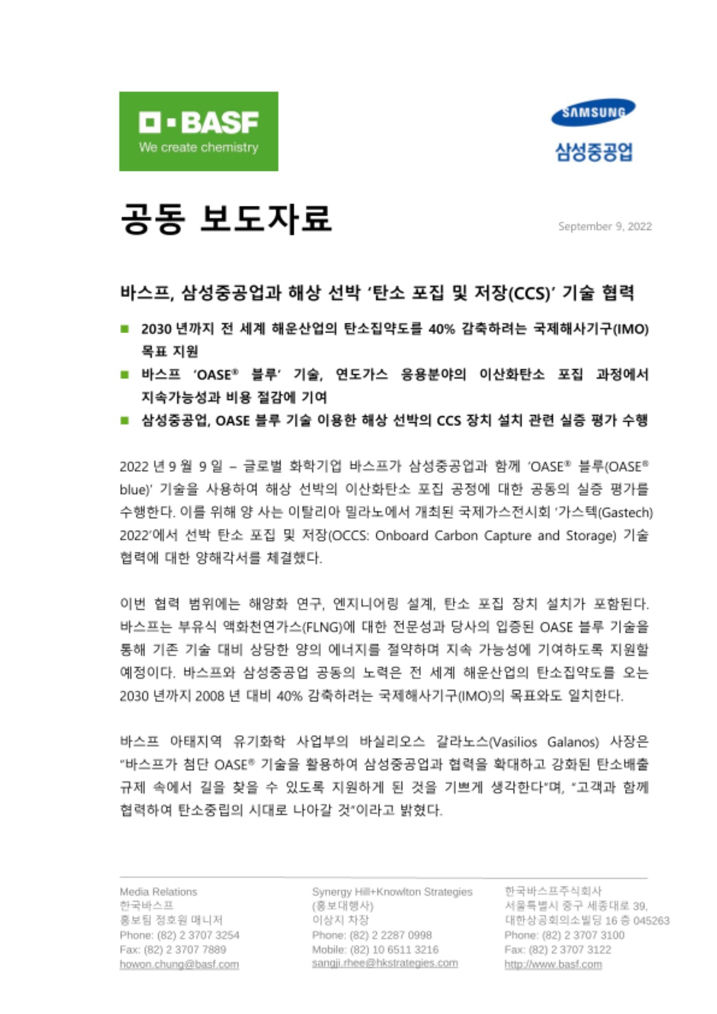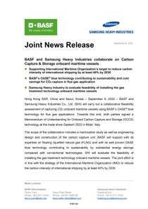 2022년 9월 9일 – 글로벌 화학기업 바스프가 삼성중공업과 함께 ‘OASE® 블루(OASE® blue)’ 기술을 사용하여 해상 선박의 이산화탄소 포집 공정에 대한 공동의 실증 평가를 수행한다. 이를 위해 양 사는 이탈리아 밀라노에서 개최된 국제가스전시회 ‘가스텍(Gastech) 2022’에서 선박 탄소 포집 및 저장(OCCS: Onboard Carbon Capture and Storage) 기술 협력에 대한 양해각서를 체결했다.