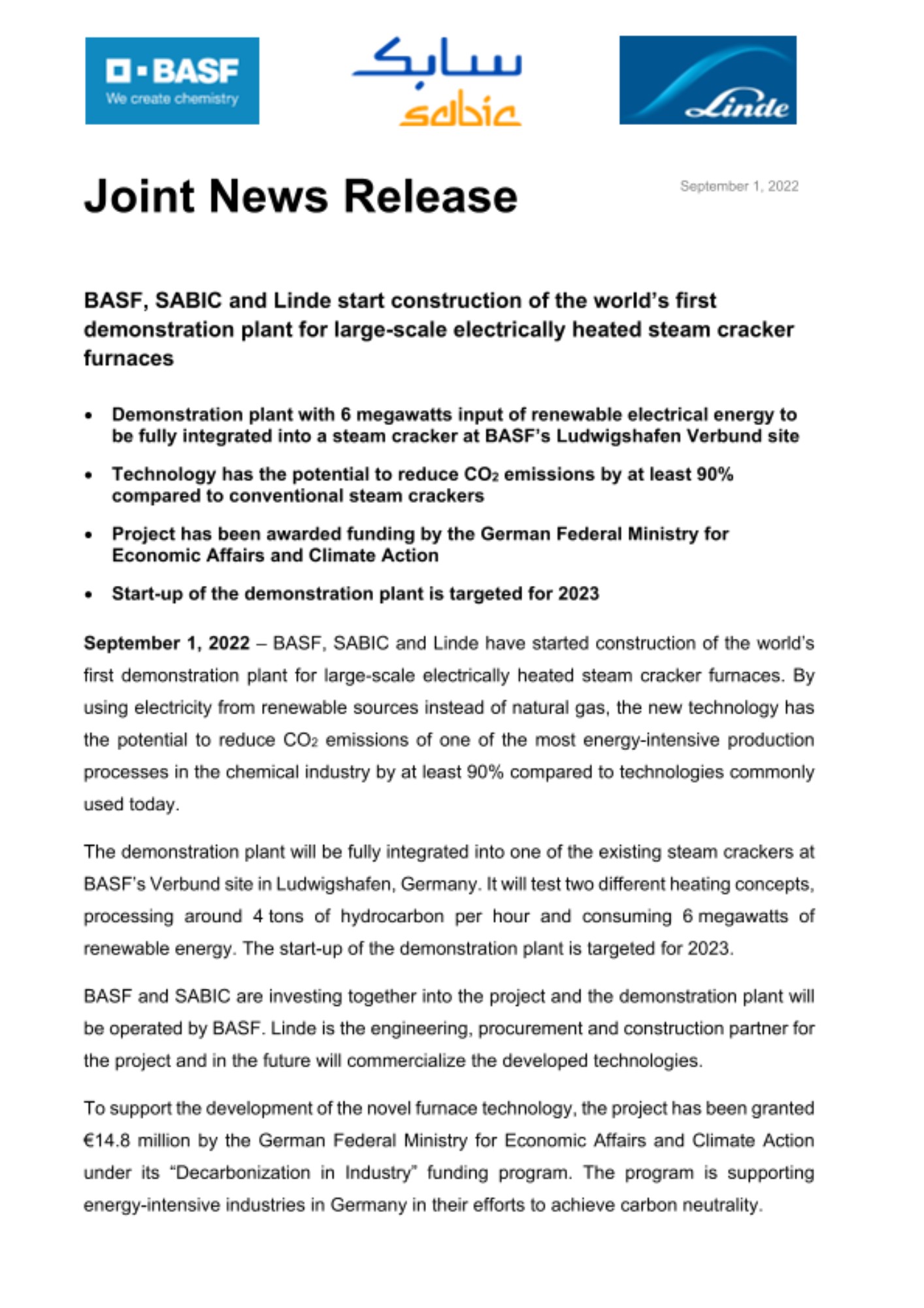 2022년 9월 19일 – 글로벌 화학기업 바스프가 사빅(SABIC), 린데(Linde)와 함께 대규모 전기 가열 증기 분해기용 용광로를 위한 세계 최초의 시범 공장을 착공했다. 이번 신기술은 천연 가스 대신 재생 가능한 전기 에너지를 사용함으로써, 오늘날 일반적으로 사용되는 기존 기술에 비해 화학 산업에서 가장 에너지 집약적인 생산 공정으로부터 CO2 배출량을 90% 이상 줄일 수 있는 잠재력을 갖고 있다.