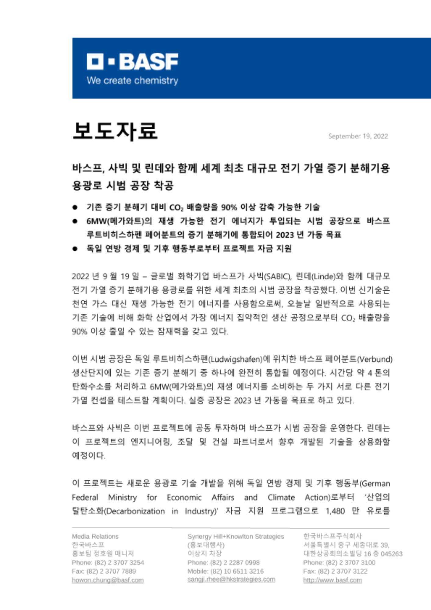 - 6MW(메가와트)의 재생 가능한 전기 에너지가 투입되는 시범 공장으로 바스프 루트비히스하펜 페어분트의 증기 분해기에 통합되어 2023년 가동 목표