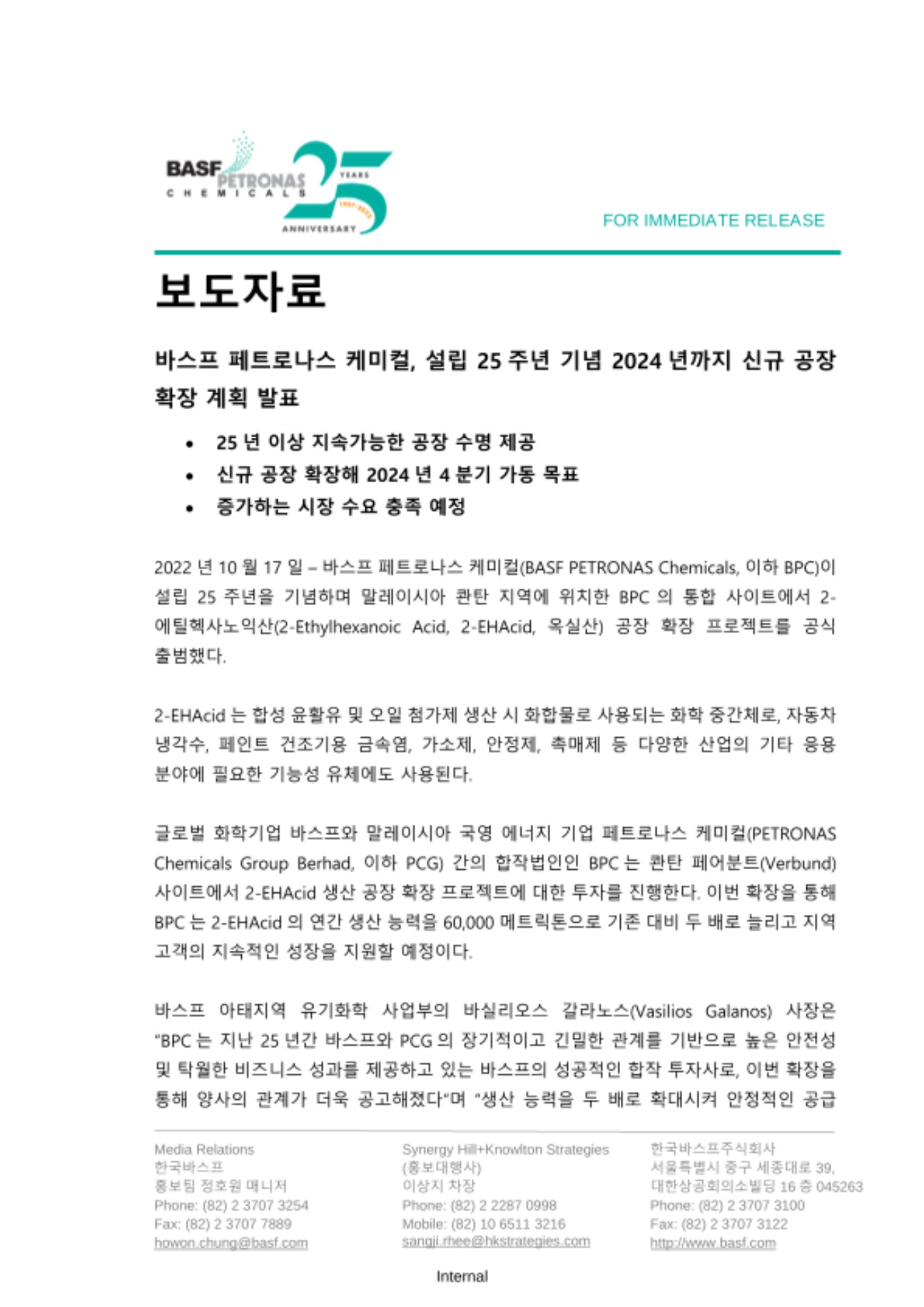 2022년 10월 17일 – 바스프 페트로나스 케미컬(BASF PETRONAS Chemicals, 이하 BPC)이 설립 25주년을 기념하며 말레이시아 콴탄 지역에 위치한 BPC의 통합 사이트에서 2-에틸헥사노익산(2-Ethylhexanoic Acid, 2-EHAcid, 옥실산) 공장 확장 프로젝트를 공식 출범했다.