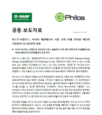 2022년 11월 9일 – 글로벌 화학기업 바스프의 100% 자회사인 BASF Stationary Energy Storage GmbH(BSES)와 국내 P2G(Power to Gas, 재생에너지 이용 그린수소 생산 시스템) 분야 선도 업체인 (주)지필로스는 지난 1일, P2G 프로젝트, 전력망 및 마이크로그리드 응용분야에 활용 가능한 바스프의 NAS 배터리 (나트륨-황 전지)에 대한 영업 및 마케팅 협약을 체결했다. 이날 지필로스는 바스프와 12 MWh 규모 NAS 배터리 구매계약도 함께 체결했다.