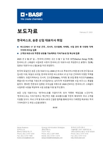 2023년 2월 27일 – 한국바스프㈜는 오는 3월 1일 자로 송준(Dschun Song) 현(現) 한국바스프 스페셜티 사업부문 사장이 한국바스프 대표이사로 취임한다고 밝혔다. 현(現) 임윤순 대표이사는 2월 28일 자로 퇴임한다.