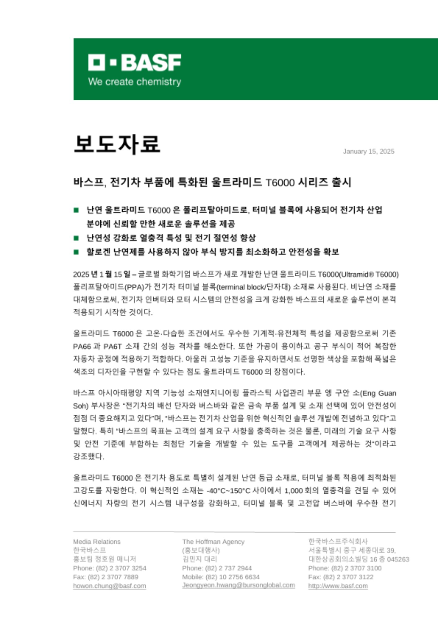 2025년 1월 15일 – 글로벌 화학기업 바스프가 새로 개발한 난연 울트라미드 T6000(Ultramid® T6000) 폴리프탈아미드(PPA)가 전기차 터미널 블록(terminal block/단자대) 소재로 사용된다. 비난연 소재를 대체함으로써, 전기차 인버터와 모터 시스템의 안전성을 크게 강화한 바스프의 새로운 솔루션이 본격 적용되기 시작한 것이다.