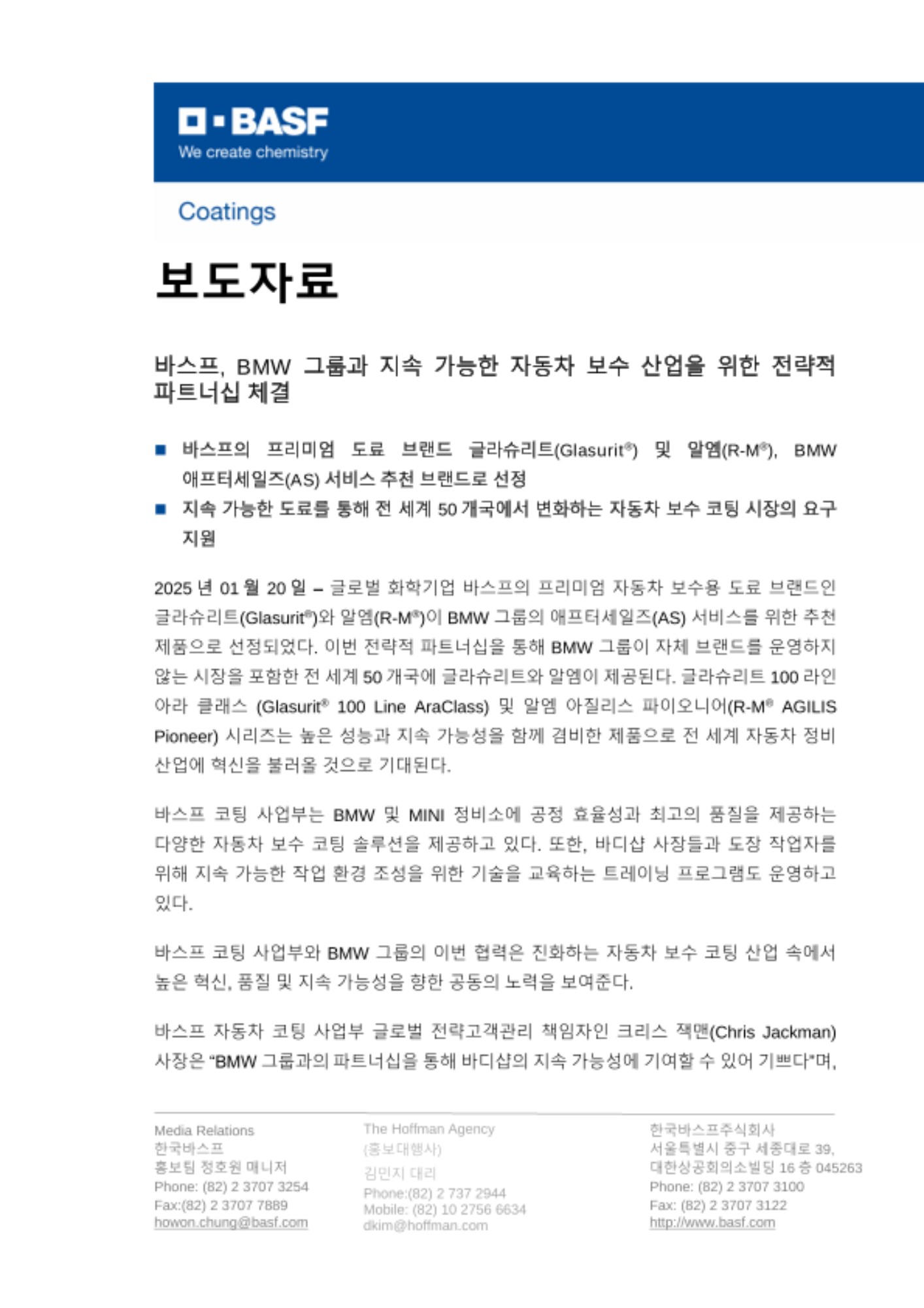 2025년 01월 20일 – 글로벌 화학기업 바스프의 프리미엄 자동차 보수용 도료 브랜드인 글라슈리트(Glasurit®)와 알엠(R-M®)이 BMW 그룹의 애프터세일즈(AS) 서비스를 위한 추천 제품으로 선정되었다. 이번 전략적 파트너십을 통해 BMW 그룹이 자체 브랜드를 운영하지 않는 시장을 포함한 전 세계 50개국에 글라슈리트와 알엠이 제공된다. 글라슈리트 100 라인 아라 클래스 (Glasurit® 100 Line AraClass) 및 알엠 아질리스 파이오니어(R-M® AGILIS Pioneer) 시리즈는 높은 성능과 지속 가능성을 함께 겸비한 제품으로 전 세계 자동차 정비 산업에 혁신을 불러올 것으로 기대된다.