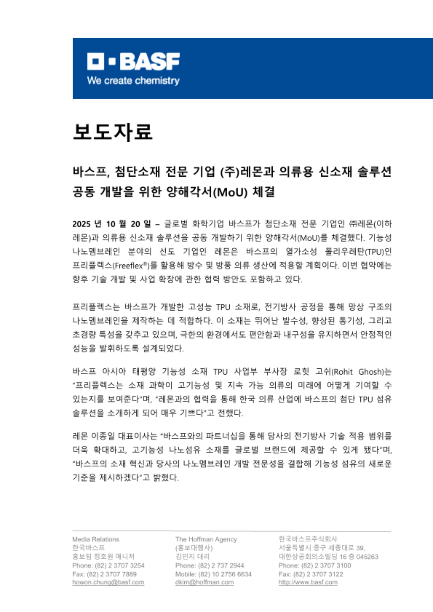 2025년 10월 20일 – 글로벌 화학기업 바스프가 첨단소재 전문 기업인 ㈜레몬(이하 레몬)과 의류용 신소재 솔루션을 공동 개발하기 위한 양해각서(MoU)를 체결했다. 기능성 나노멤브레인 분야의 선도 기업인 레몬은 바스프의 열가소성 폴리우레탄(TPU)인 프리플렉스(Freeflex®)를 활용해 방수 및 방풍 의류 생산에 적용할 계획이다. 이번 협약에는 향후 기술 개발 및 사업 확장에 관한 협력 방안도 포함하고 있다.