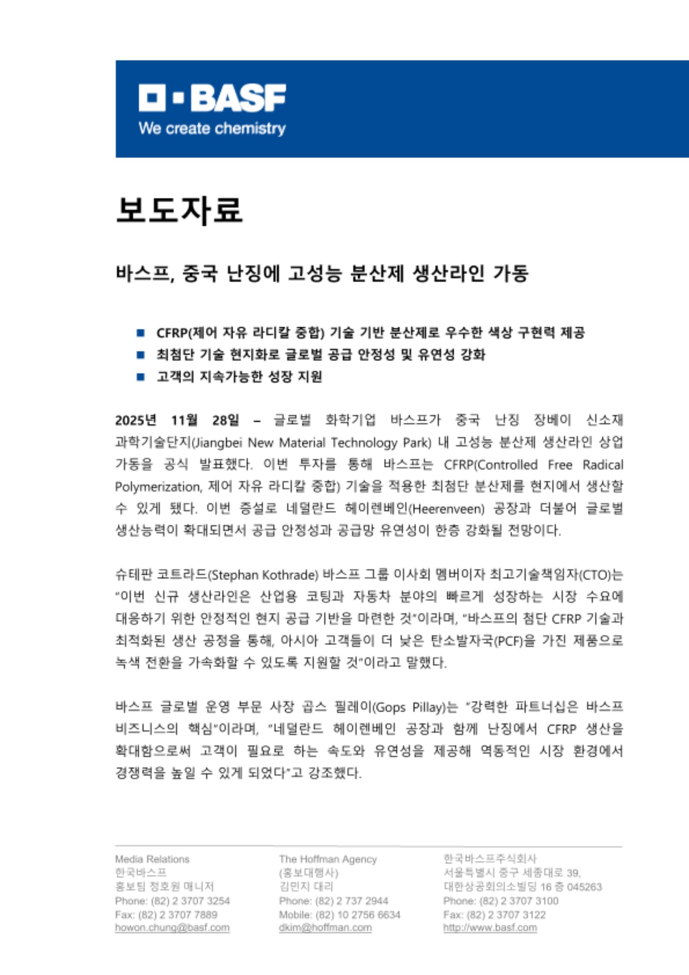 2025년 11월 28일 – 글로벌 화학기업 바스프가 중국 난징 장베이 신소재 과학기술단지(Jiangbei New Material Technology Park) 내 고성능 분산제 생산라인 상업 가동을 공식 발표했다. 이번 투자를 통해 바스프는 CFRP(Controlled Free Radical Polymerization, 제어 자유 라디칼 중합) 기술을 적용한 최첨단 분산제를 현지에서 생산할 수 있게 됐다. 이번 증설로 네덜란드 헤이렌베인(Heerenveen) 공장과 더불어 글로벌 생산능력이 확대되면서 공급 안정성과 공급망 유연성이 한층 강화될 전망이다.
