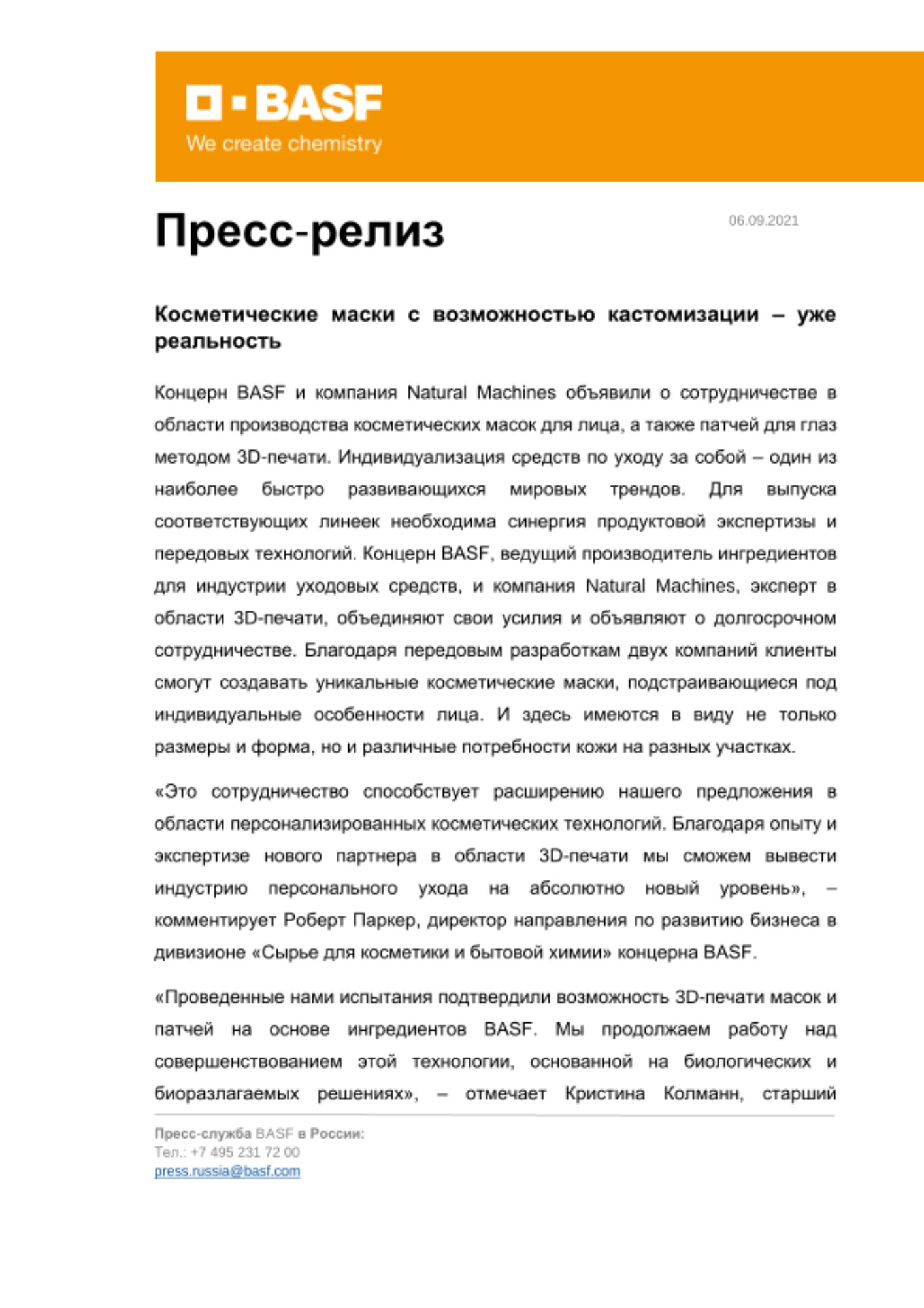 «Это сотрудничество способствует расширению нашего предложения в области персонализированных косметических технологий. Благодаря опыту и экспертизе нового партнера в области 3D-печати мы сможем вывести индустрию персонального ухода на абсолютно новый уровень», – комментирует Роберт Паркер, директор направления по развитию бизнеса в дивизионе «Сырье для косметики и бытовой химии» концерна BASF.