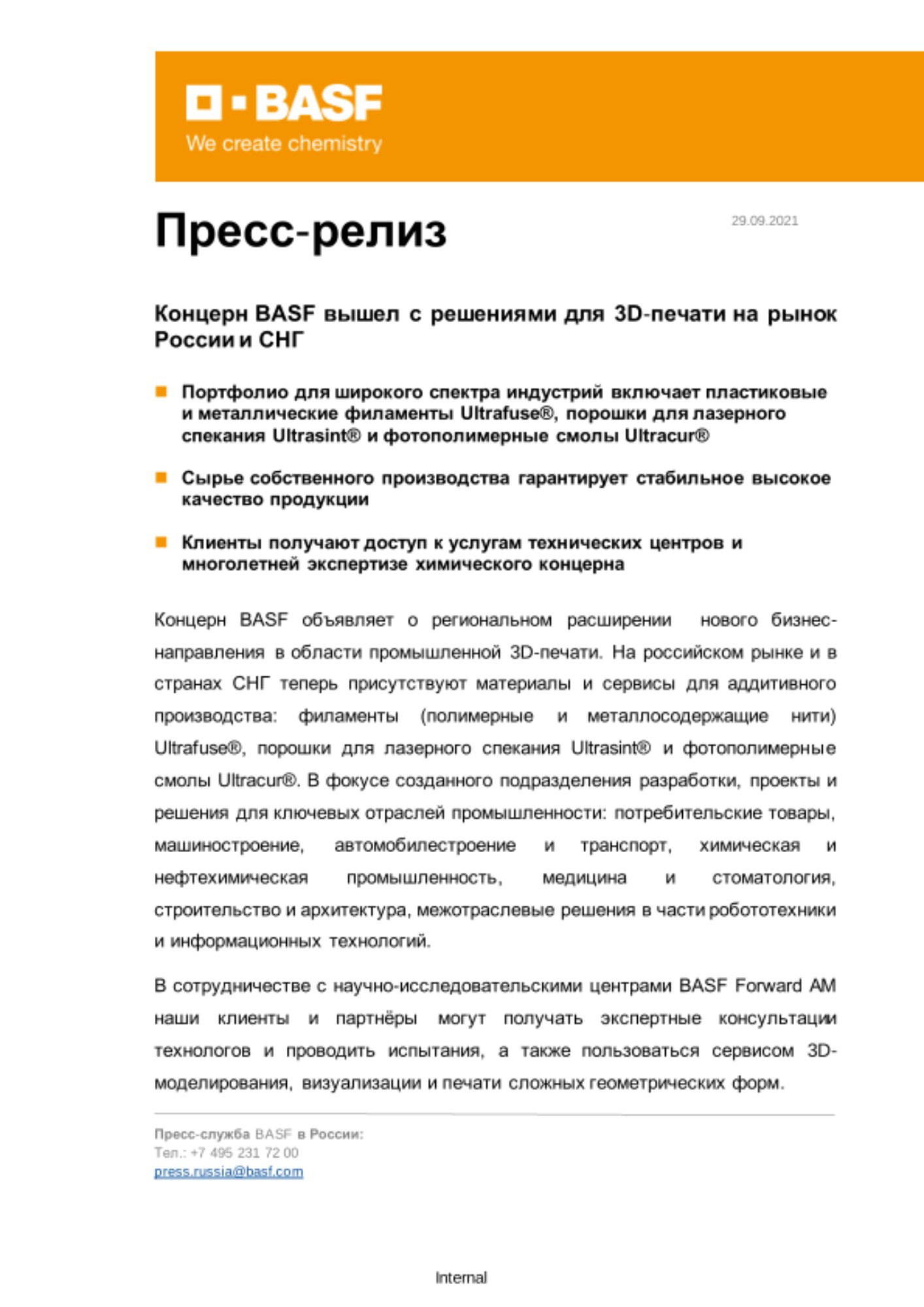 Концерн BASF объявляет о региональном расширении нового бизнес-направления в области промышленной 3D-печати. На российском рынке и в странах СНГ теперь присутствуют материалы и сервисы для аддитивного производства: филаменты (полимерные и металлосодержащие нити) Ultrafuse®, порошки для лазерного спекания Ultrasint® и фотополимерные смолы Ultracur®. В фокусе созданного подразделения разработки, проекты и решения для ключевых отраслей промышленности: потребительские товары, машиностроение, автомобилестроение и транспорт, химическая и нефтехимическая промышленность, медицина и стоматология, строительство и архитектура, межотраслевые решения в части робототехники и информационных технологий.