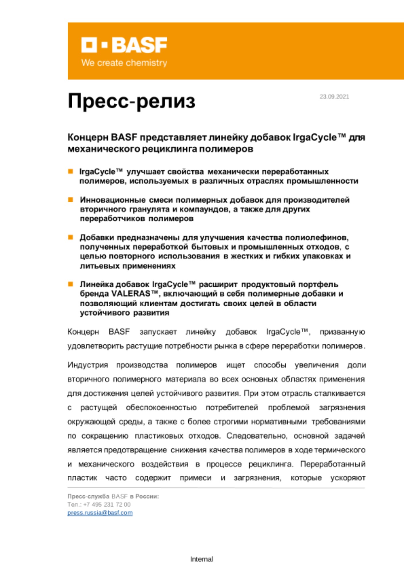 «Ожидается, что к 2030 году производство пластмасс посредством механического рециклинга увеличится практически втрое благодаря усовершенствованным технологиям и нормативным требованиям. Это соответствует 10-процентному годовому росту, – комментирует д-р Томас Клостер, президент дивизиона «Функциональные материалы» концерна BASF. – С линейкой IrgaCycle™ мы шаг за шагом расширяем наш существующий продуктовый портфель специальными решениями для рециклинга, чтобы достигнуть целей экономики замкнутого цикла в сфере обращения с пластиком».