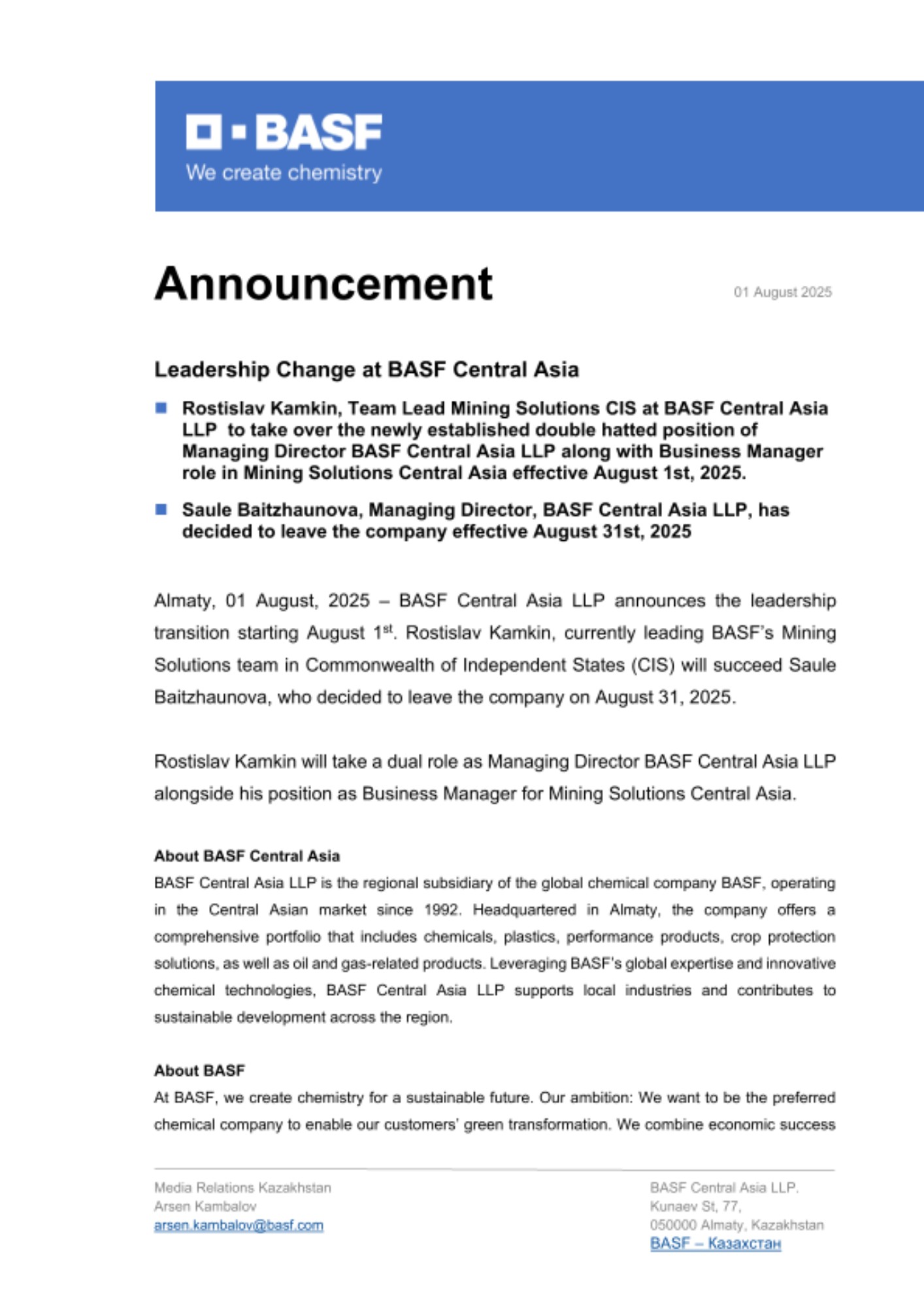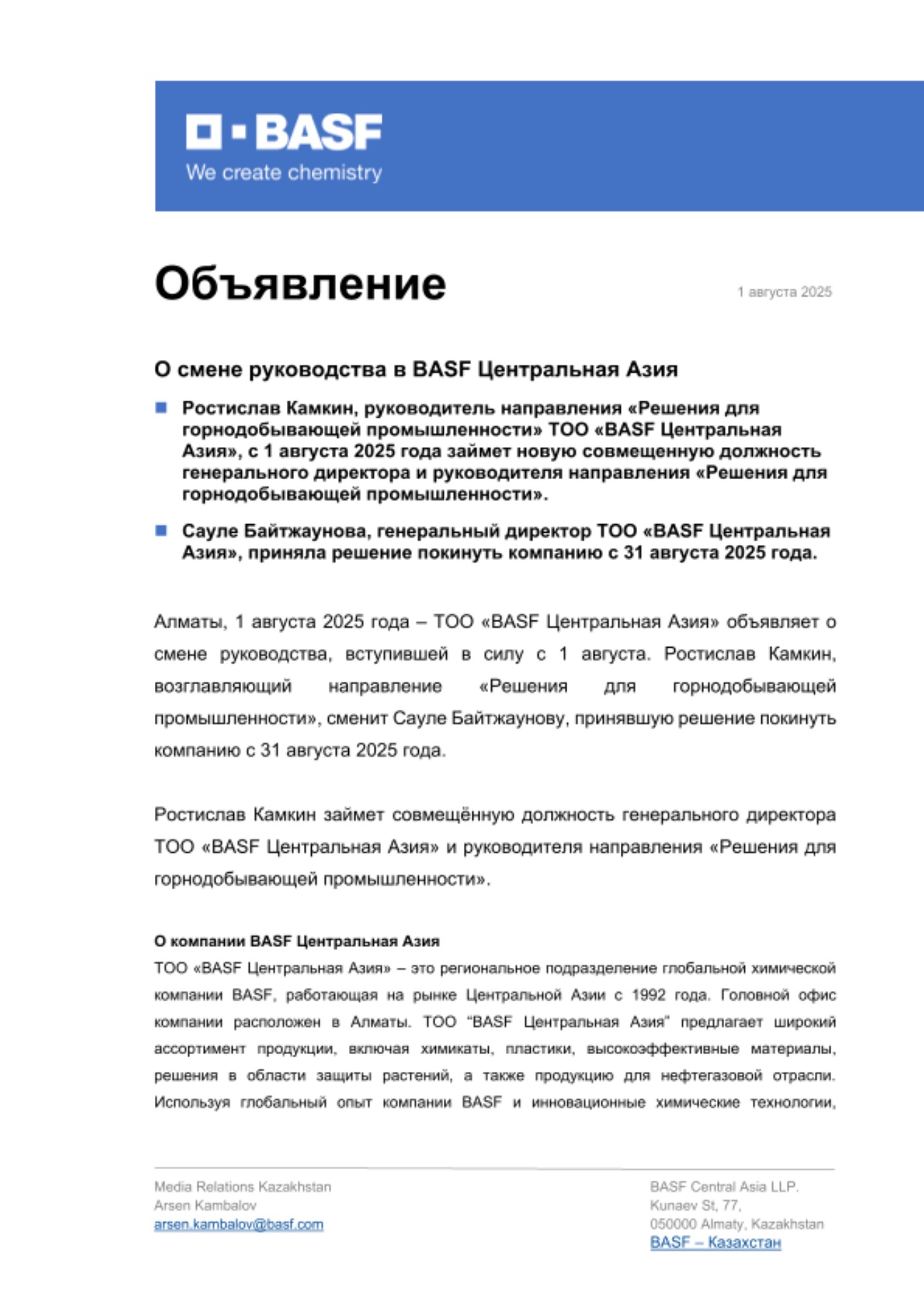Алматы, 1 августа 2025 года – ТОО «BASF Центральная Азия» объявляет о смене руководства, вступившей в силу с 1 августа. Ростислав Камкин, возглавляющий направление «Решения для горнодобывающей промышленности», сменит Сауле Байтжаунову, принявшую решение покинуть компанию с 31 августа 2025 года.