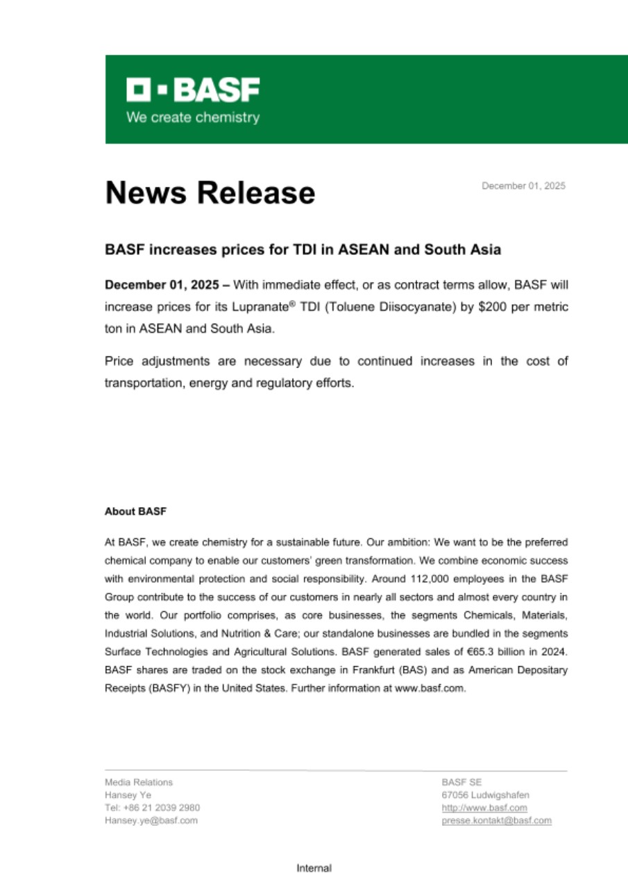 December 01, 2025 – With immediate effect, or as contract terms allow, BASF will increase prices for its Lupranate® TDI (Toluene Diisocyanate) by $200 per metric ton in ASEAN and South Asia.