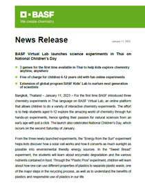 Bangkok, Thailand – January 11, 2023 – For the first time BASF introduced three chemistry experiments in Thai language on BASF Virtual Lab, an online platform that allows children to do a variety of interactive chemistry experiments. The effort is to help students aged 6-12 explore the amazing world of chemistry through fun hands-on experiments, hence igniting their passion for natural sciences from an early age with just a click. The launch also celebrates National Children’s Day, which occurs on the second Saturday of January.